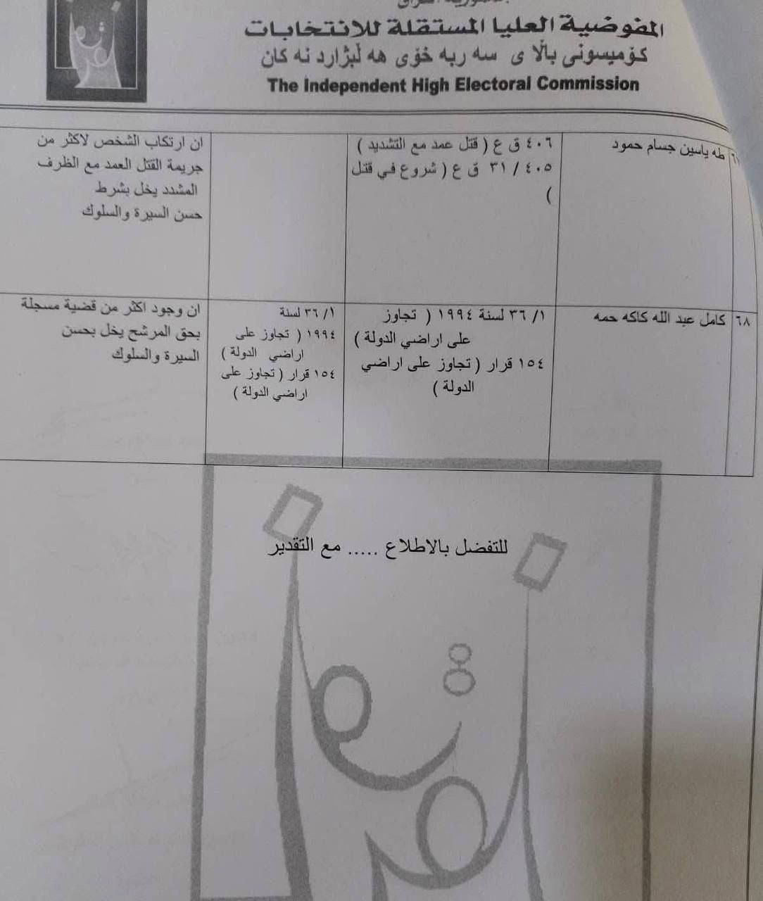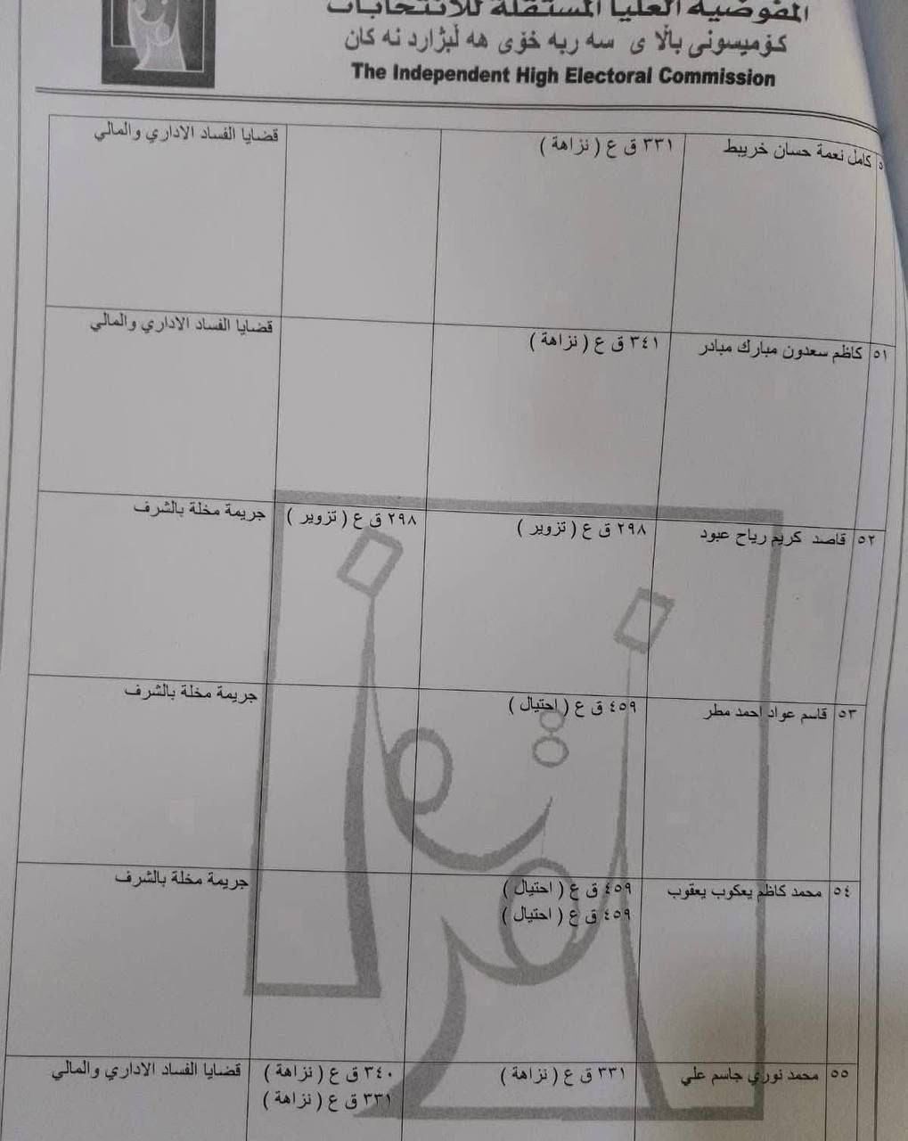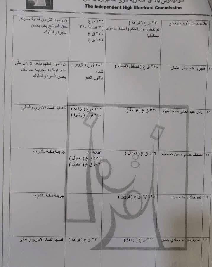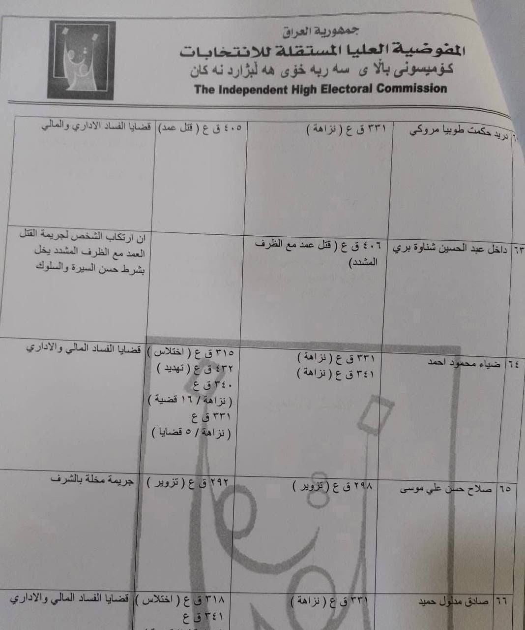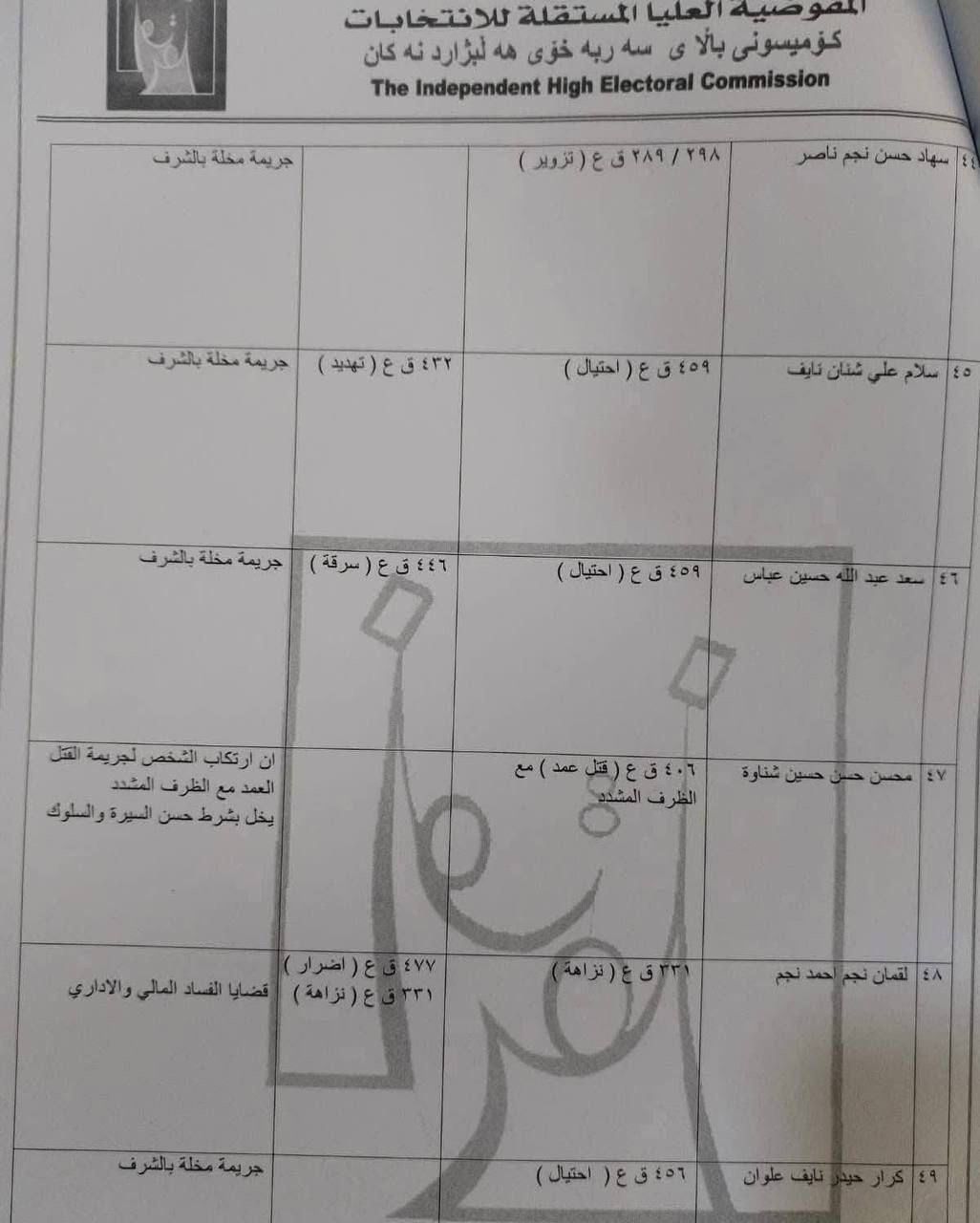 ووفقاً لوثائق صادرة عن المفوضية، تحققت شبكة أخبار الانتخابات العراقية من صحتها، فأن التوصية بالاستبعاد، جاءت استناداً لنتائج تدقيق وكالة شؤون الشرطة في وزارة الداخلية، ارتباط أسماء أولئك المرشحين بقضايا مختلفة تتعلق بأحكام جنائية وأخرى ترتبط بشبهات فساد وتزوير.