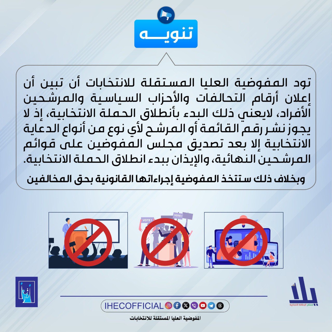 وأوضحت المفوضية في تنويهها، أنه “لا يجوز نشر رقم القائمة أو المرشح لأي نوع من أنواع الدعاية الانتخابية إلا بعد تصديق مجلس المفوضين على قوائم المرشحين النهائية، والإيذان ببدء انطلاق الحملة الانتخابية. وبخلاف ذلك ستتخذ المفوضية إجراءاتها القانونية بحق المخالفين”.