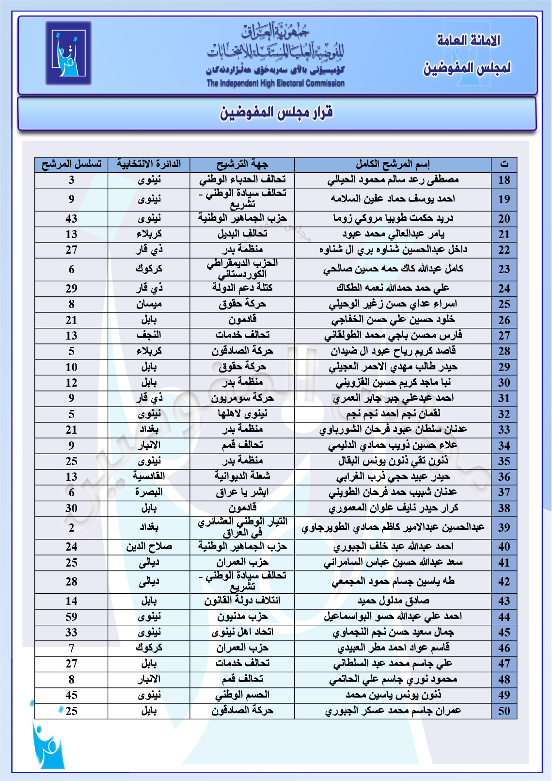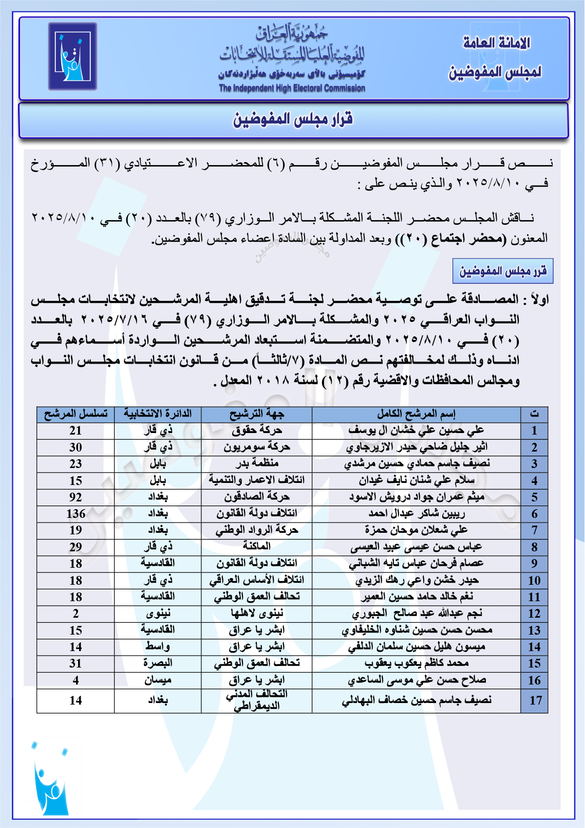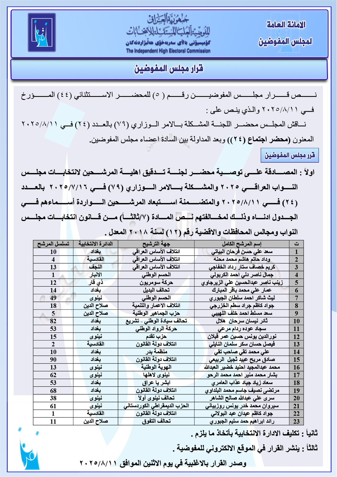 وثائق: مجلس المفوضين يصادق على استبعاد 88 مرشحاً من الانتخابات النيابية المقبلة بينهم جمال الكربولي ونجم الجبوري وآخرون