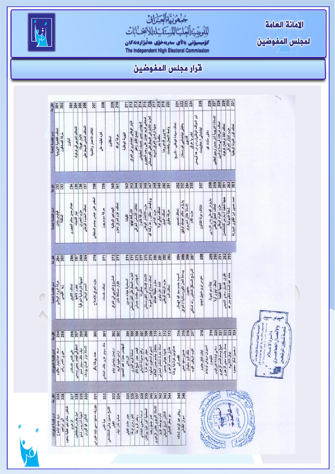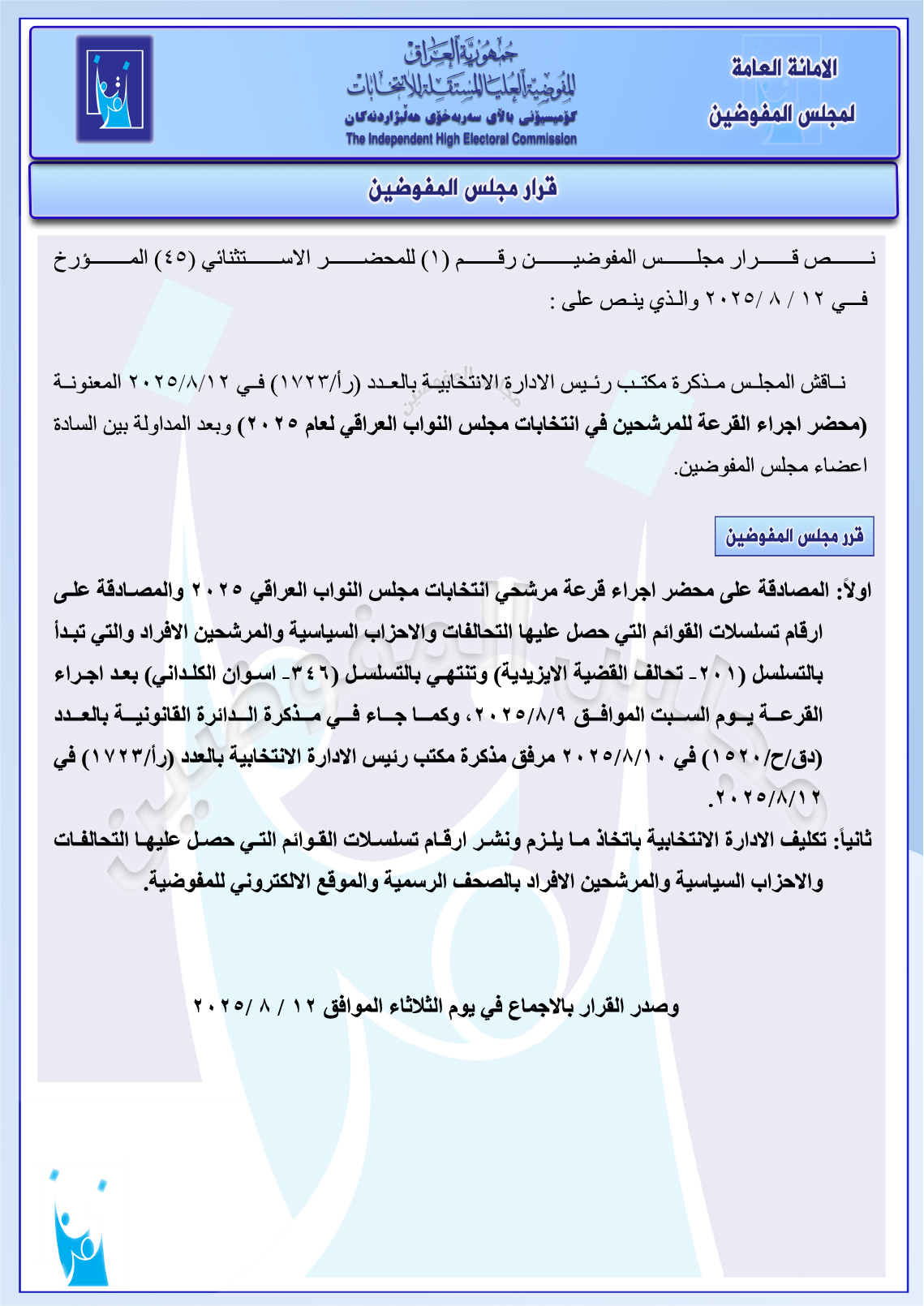 مجلس المفوضين يصادق على محضر إجراء القرعة لمرشحي انتخابات مجلس النواب 2025 (وثائق)أعاد نشر أرقام تسلسلات القوائم