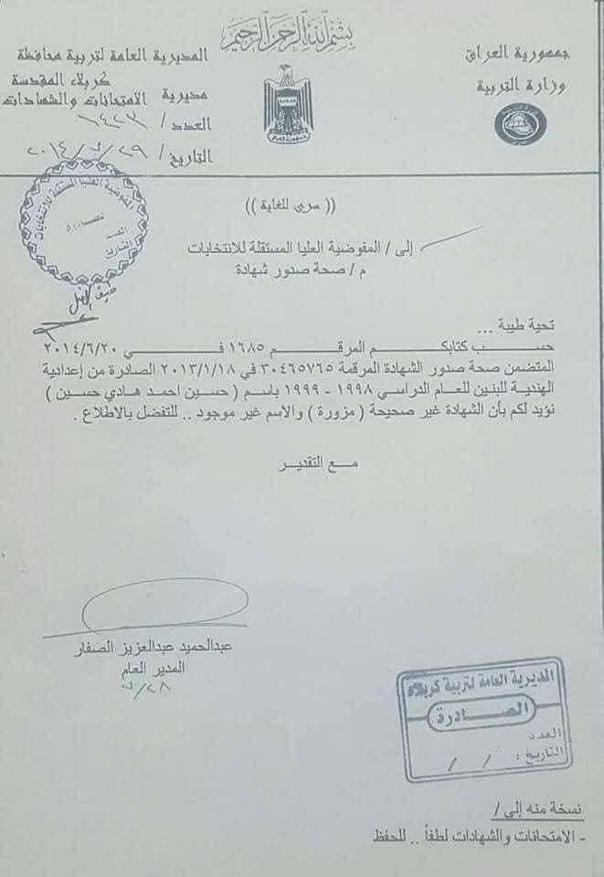 نفت المفوضية العليا المستقلة للانتخابات، الأخبار والوثائق المتداولة حول استبعاد المرشح في ائتلاف دولة القانون ياسر صخيل المالكي، مبيّنة أن الأخبار غير صحيحة وأن الوثائق المتدوالة تعود لسنوات سابقة.