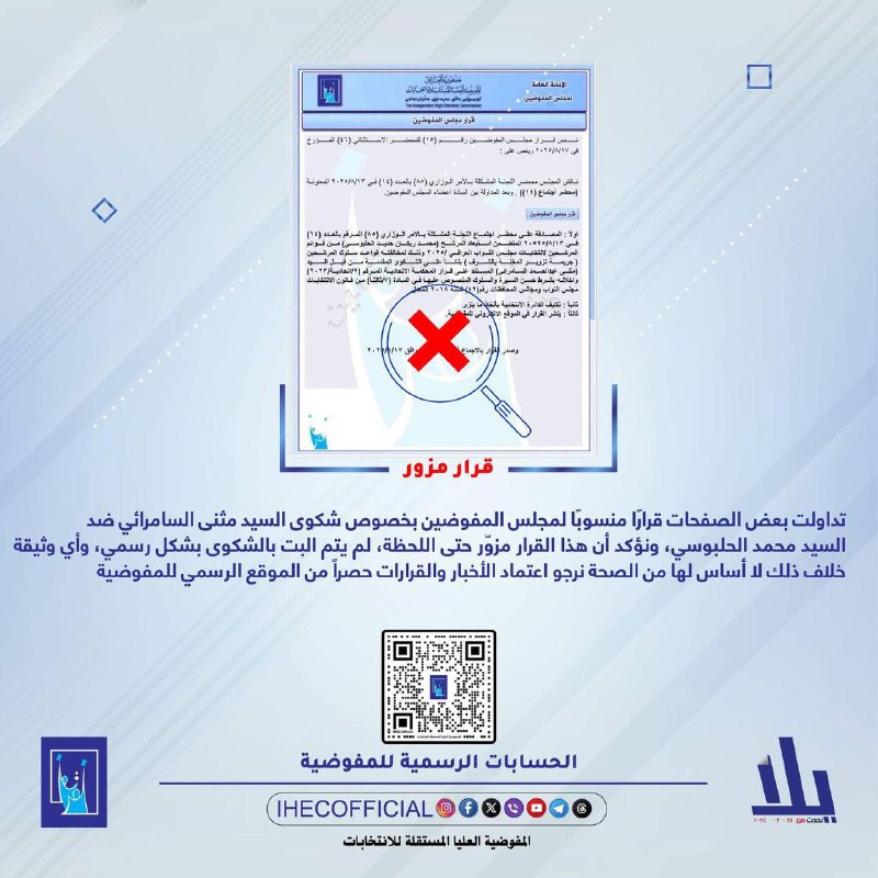وقالت المفوضية في توضيح لها، إن “بعض الصفحات تداول قراراً منسوباً لمجلس المفوضين بخصوص شكوى مثنى السامرائي ضد محمد الحلبوسي ونؤكد أن هذا القرار مزوّر”، مبينة أن المجلس، “لم يبت رسمياً حتى اللحظة بالشكوى، وأية وثيقة خلاف ذلك لا أساس لها من الصحة”.