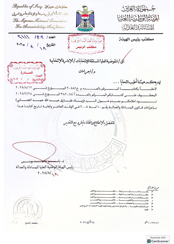 وجهت هيأة المساءلة والعدالة، اليوم الاثنين، مخاطبة رسمية للمفوضية العليا المستقلة للانتخابات أكدت فيه عدم شمول النائب زياد الجنابي غير مشمول بإجراءات المساءلة والعدالة، وفقاً لكتاب رسمي صادر عن الهيأة.