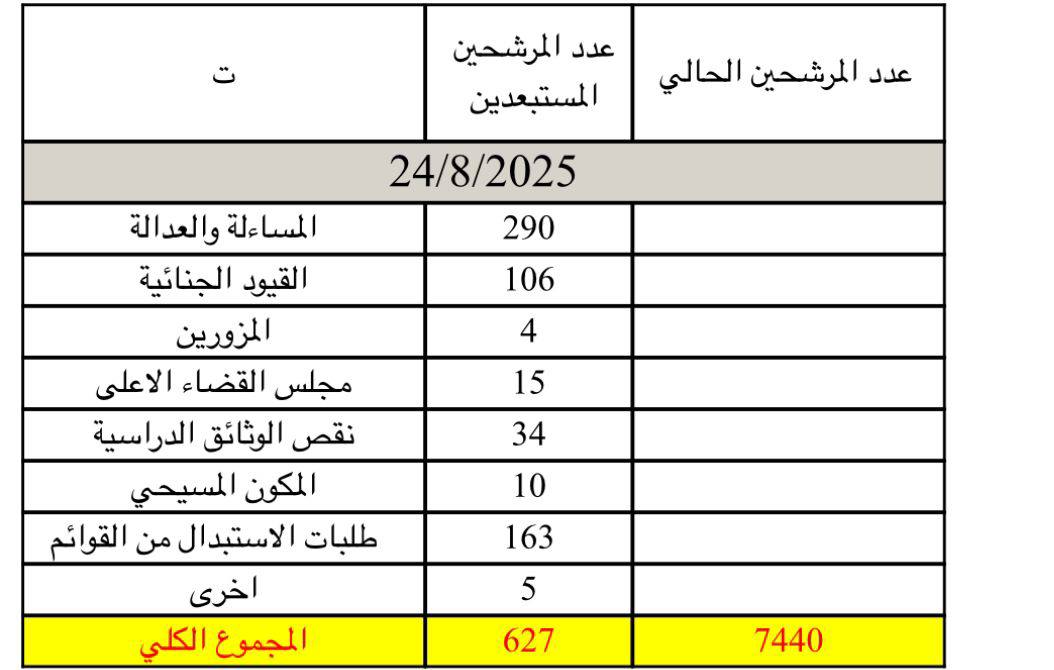 أعلنت المفوضية العليا المستقلة للانتخابات، آخر حصيلة لعدد المستبعدين من الانتخابات لأسباب مختلفة، مبيّنة أن العدد النهائي بلغ 627 مرشحاً لغاية يوم الأحد الموافق 24/8/2025، وفقاً للجدول الذي نشرته المفوضية: