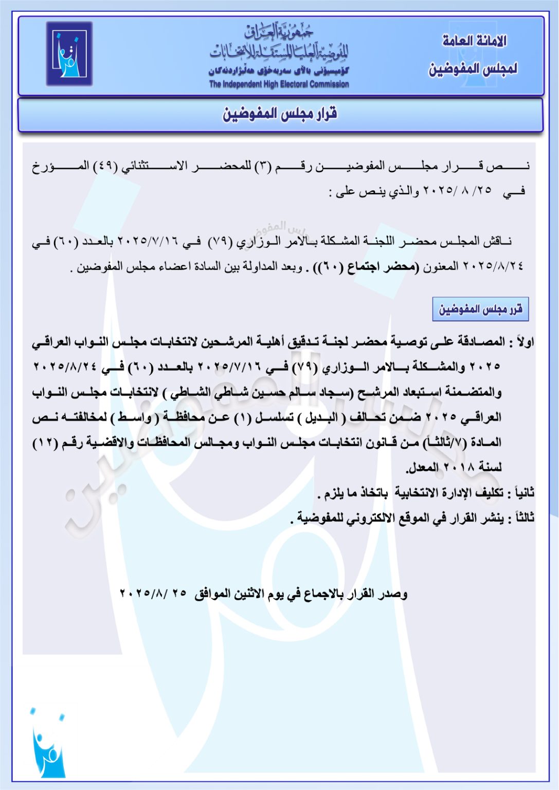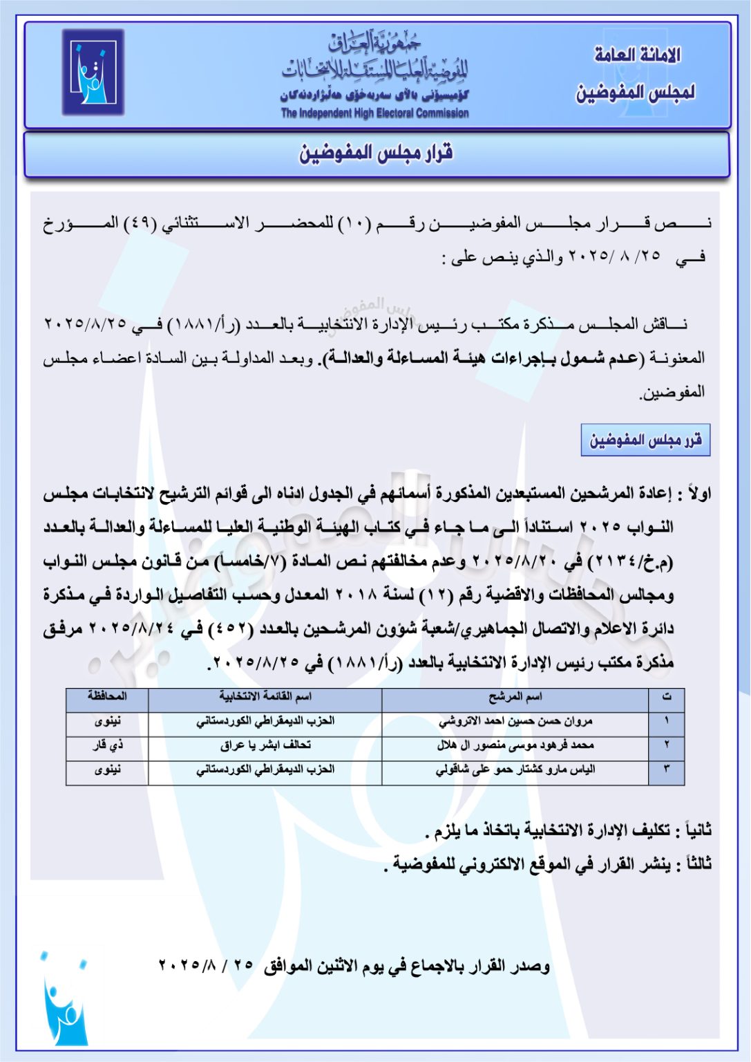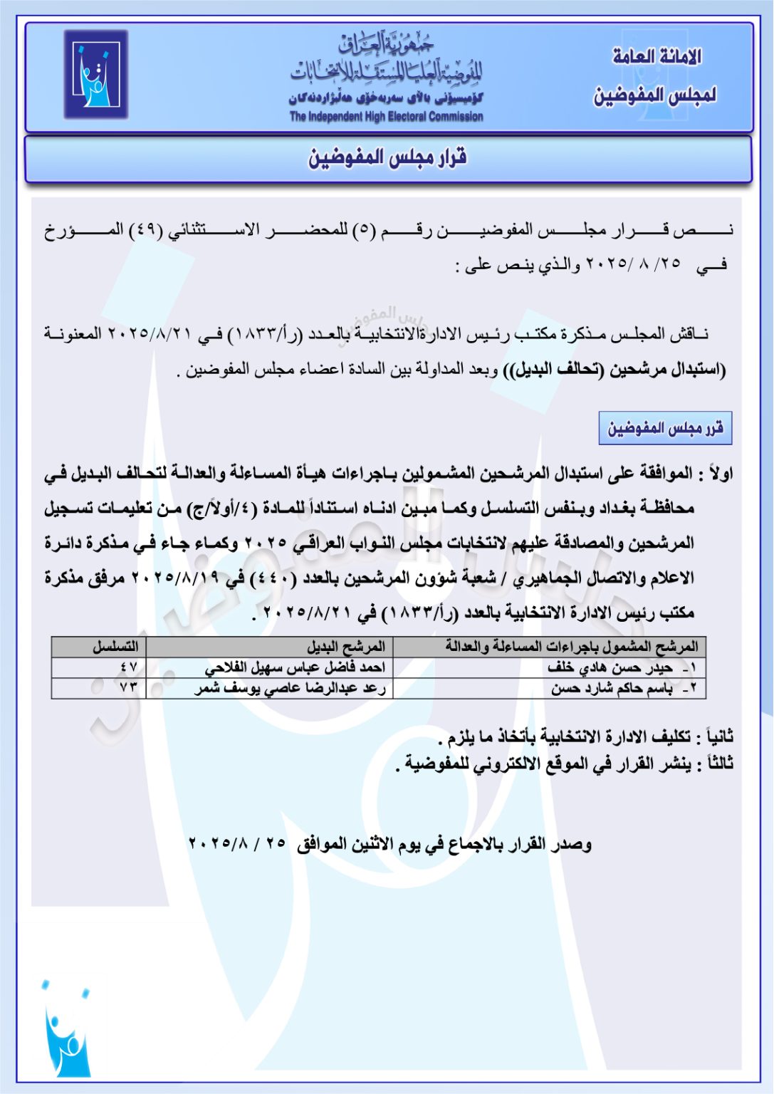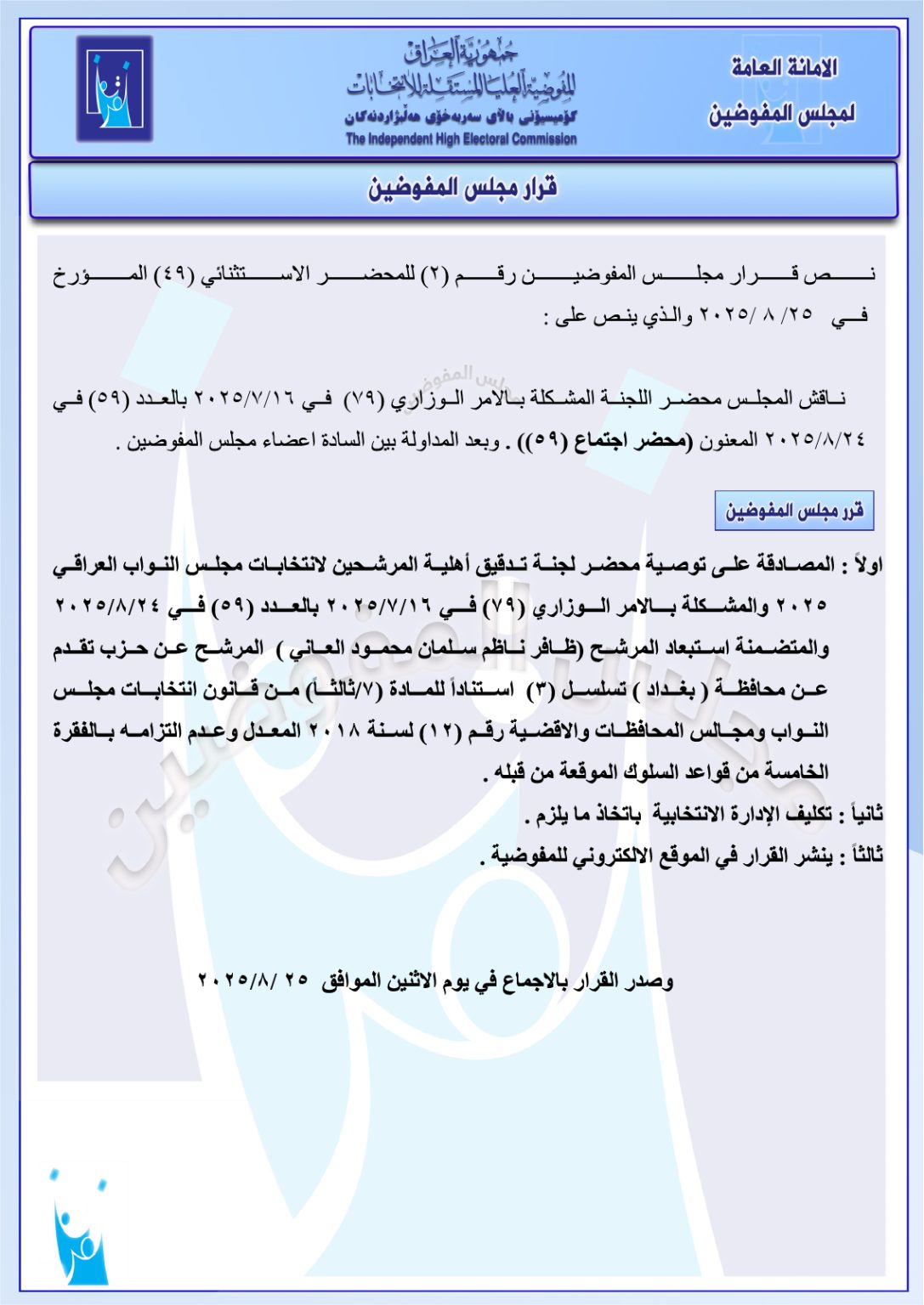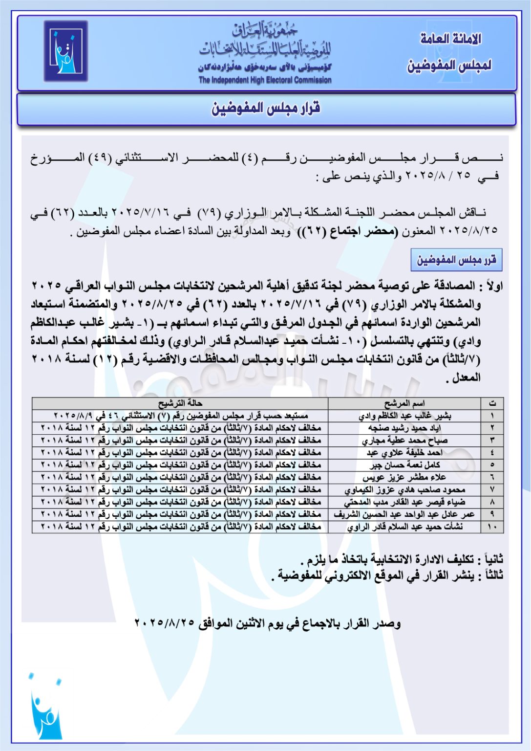 جميع قرارات مجلس المفوضين بتاريخ 25 آب.. استبعاد مجموعة مرشحين واستبدال آخرين وغيرها تتضمن رد شكوى مثنى السامرائي وقرارات استبعاد سجاد سالم وظافر العاني ومحمد سامي وآخرين