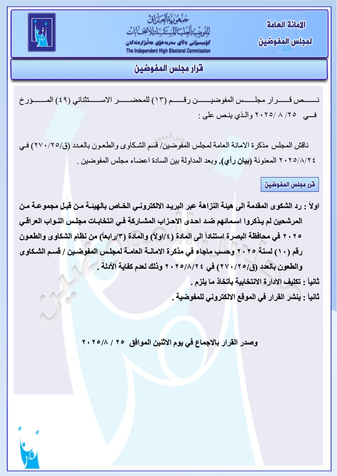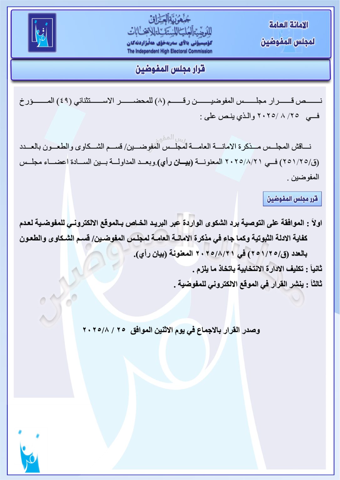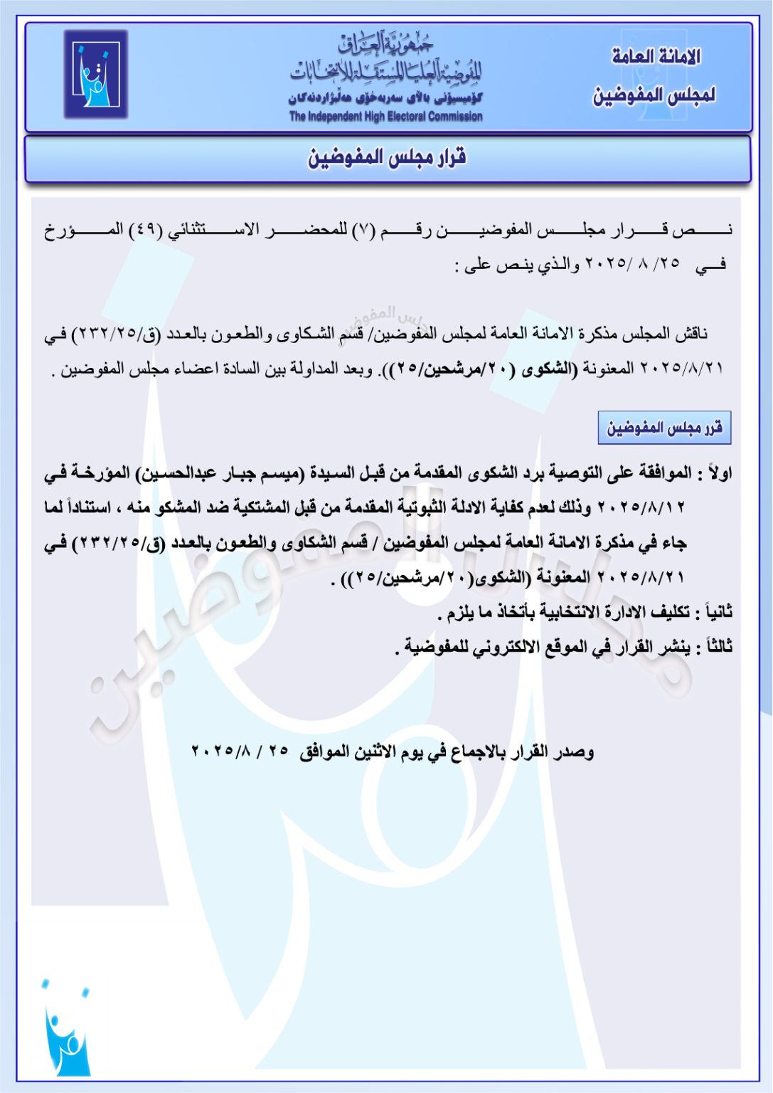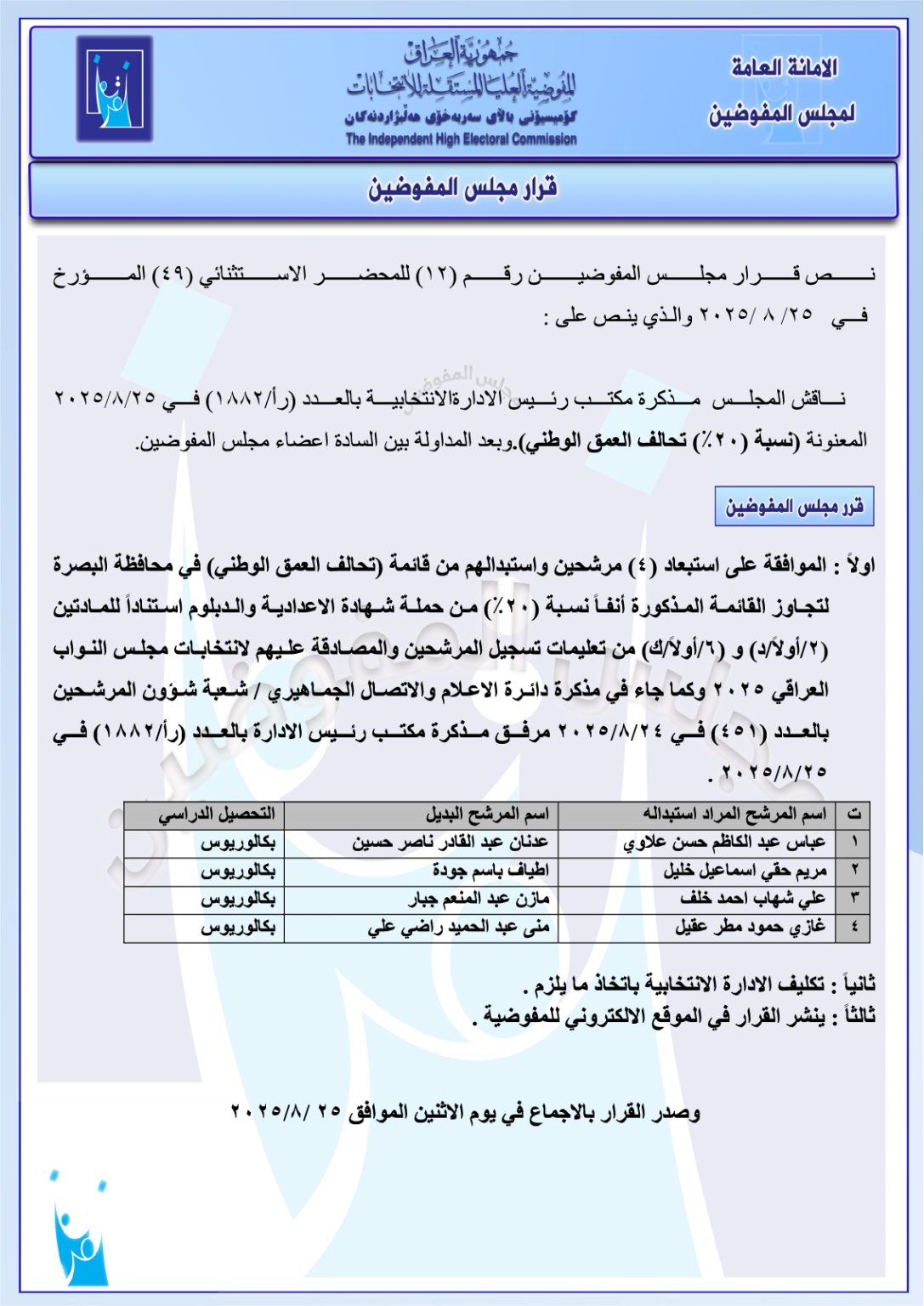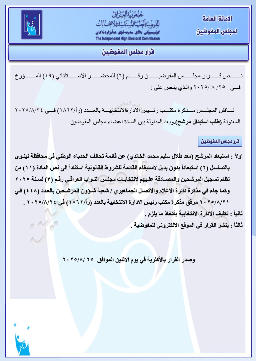 جميع قرارات مجلس المفوضين بتاريخ 25 آب.. استبعاد مجموعة مرشحين واستبدال آخرين وغيرها تتضمن رد شكوى مثنى السامرائي وقرارات استبعاد سجاد سالم وظافر العاني ومحمد سامي وآخرين