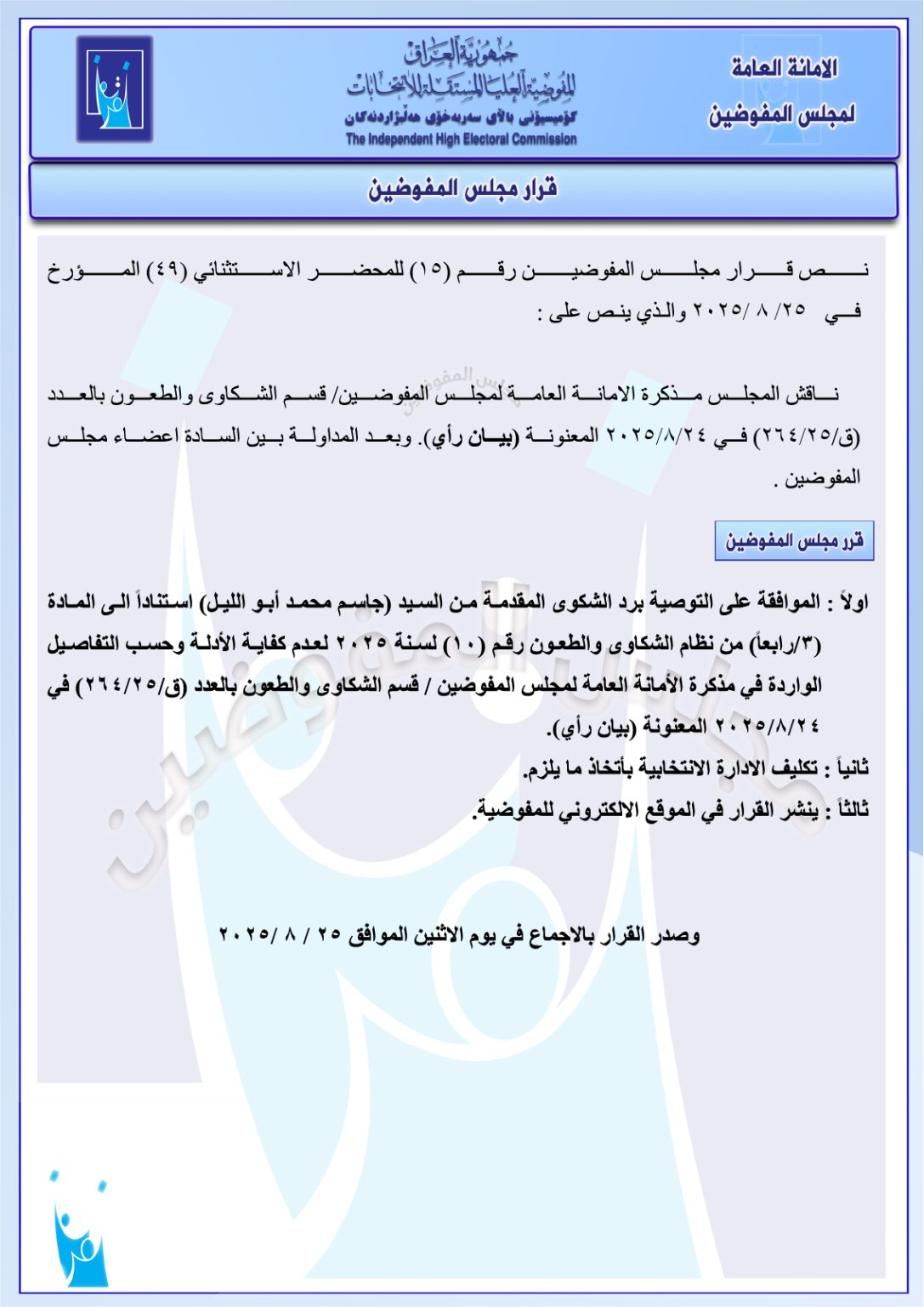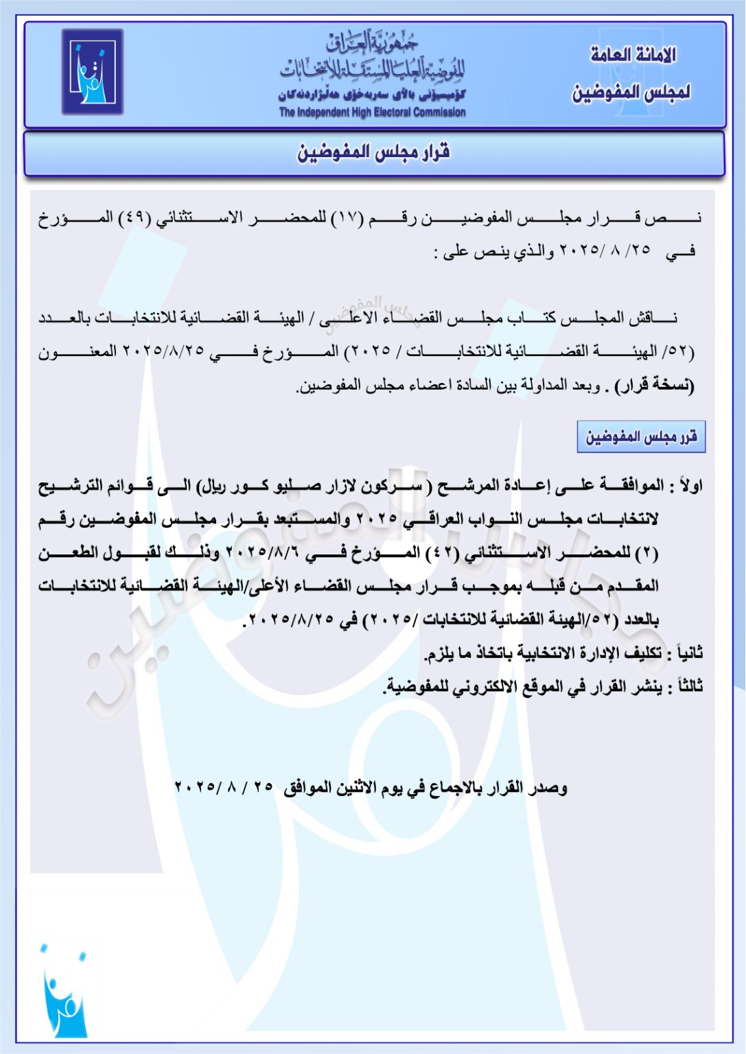 وثائق: مجلس المفوضين يقرر إعادة مرشحين اثنين إلى قوائم الترشيح.. وترد شكوى مرشح ثالث من بينهم سركون لازار صليو