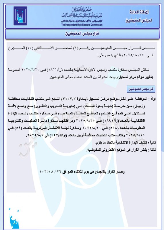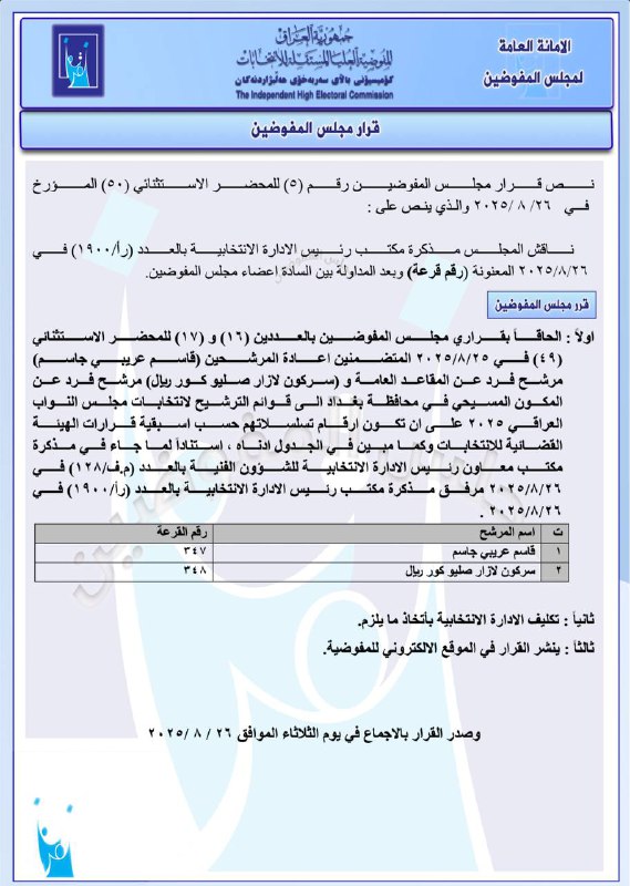 مجلس المفوضين: منح رقمي قرعة لمرشحين تمت إعادتهما إلى الانتخابات.. وتغيير موقع مركز تسجيل يتضمن وثيقتين صادرتين عن المجلس