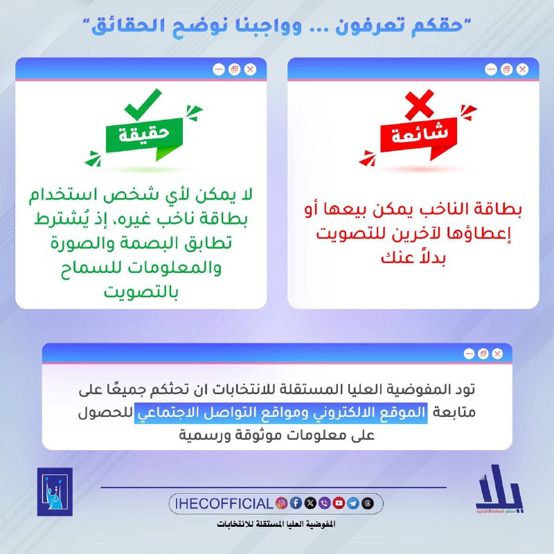 وجاء في التوضيح الذي صدر ضمن فقرة “حقكم تعرفون … وواجبنا نوضح الحقائق”، أن “شائعة إمكانية بيع بطاقة الناخب أو إعطائها للآخرين للتصويت بدلاً عنه غير صحيحة، وأن الصحيح يتمثل بعدم إمكانية استخدام أي شخص لبطاقة غيره، إذ يُشترط تطابق البصمة والصورة والمعلومات للسماح بالتصويت”.