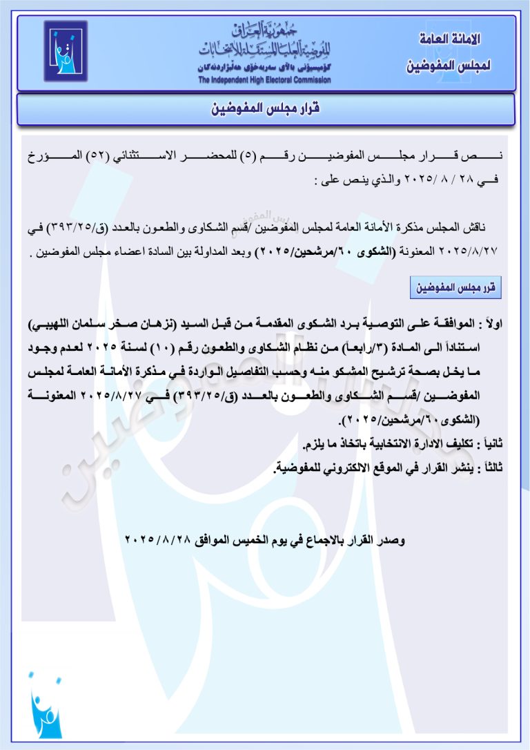 قرار جديد لمجلس المفوضين: رد شكوى مقدمة للمجلس “لعدم وجود ما يخل بصحة الترشيح” (وثيقة)