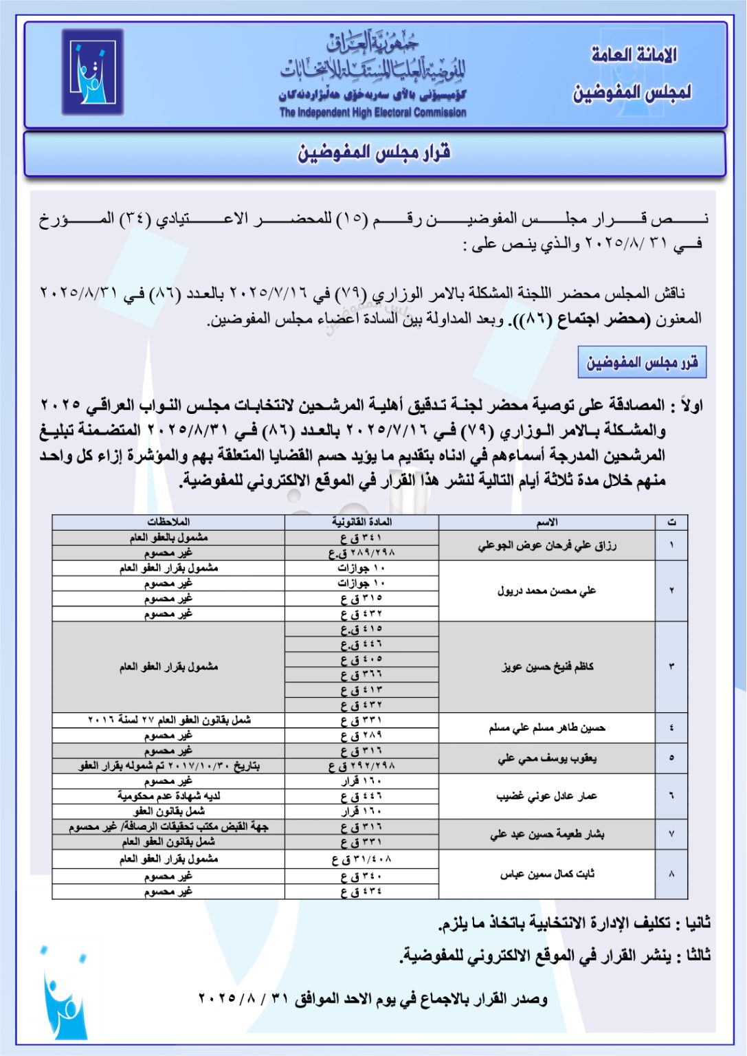 المفوضية ترسل تبليغاً إلى 8 مرشحين بتقديم ما يثبت حسم قضاياهم خلال 3 أيام (وثيقة)