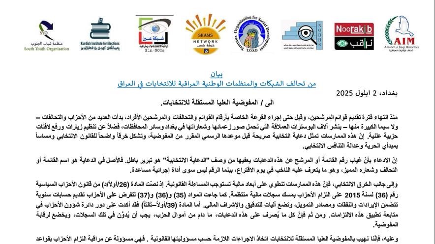 طالب تحالف شبكات ومنظمات مراقبة الانتخابات في العراق، المفوضية العليا المستقلة للانتخابات، باتخاذ الإجراءات اللازمة تجاه قيام العديد من الأحزاب والتحالفات – ولا سيما الكبيرة منها – بنشر آلاف البوسترات العملاقة التي تحمل صور زعمائها وشعاراتها في بغداد وسائر المحافظات، فضلاً عن تنظيم زيارات ورفع لافتات حزبية علنية.