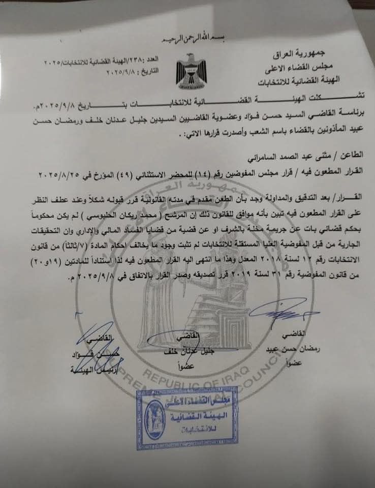 وبناءً على ذلك، قررت الهيأة القضائية نقض قرار مجلس المفوضين المطعون فيه والصادر بتاريخ ٣ آب ٢٠٢٥، وأصدرت حكمها بالمصادقة على ترشيح الحلبوسي بشكل رسمي ونهائي.
