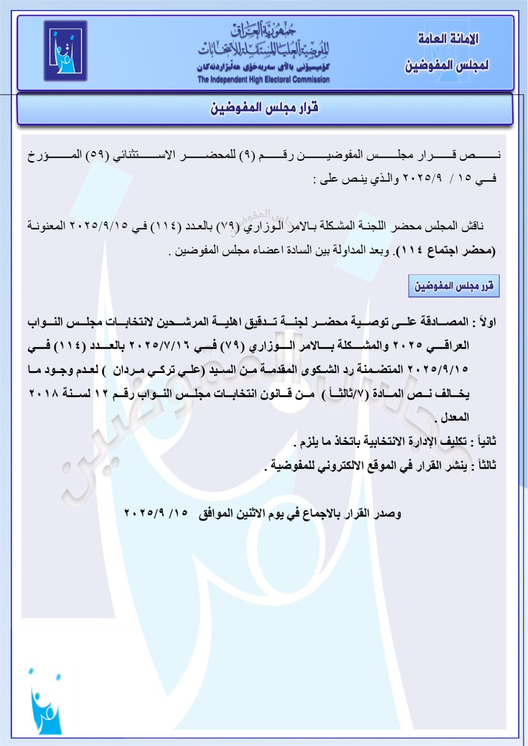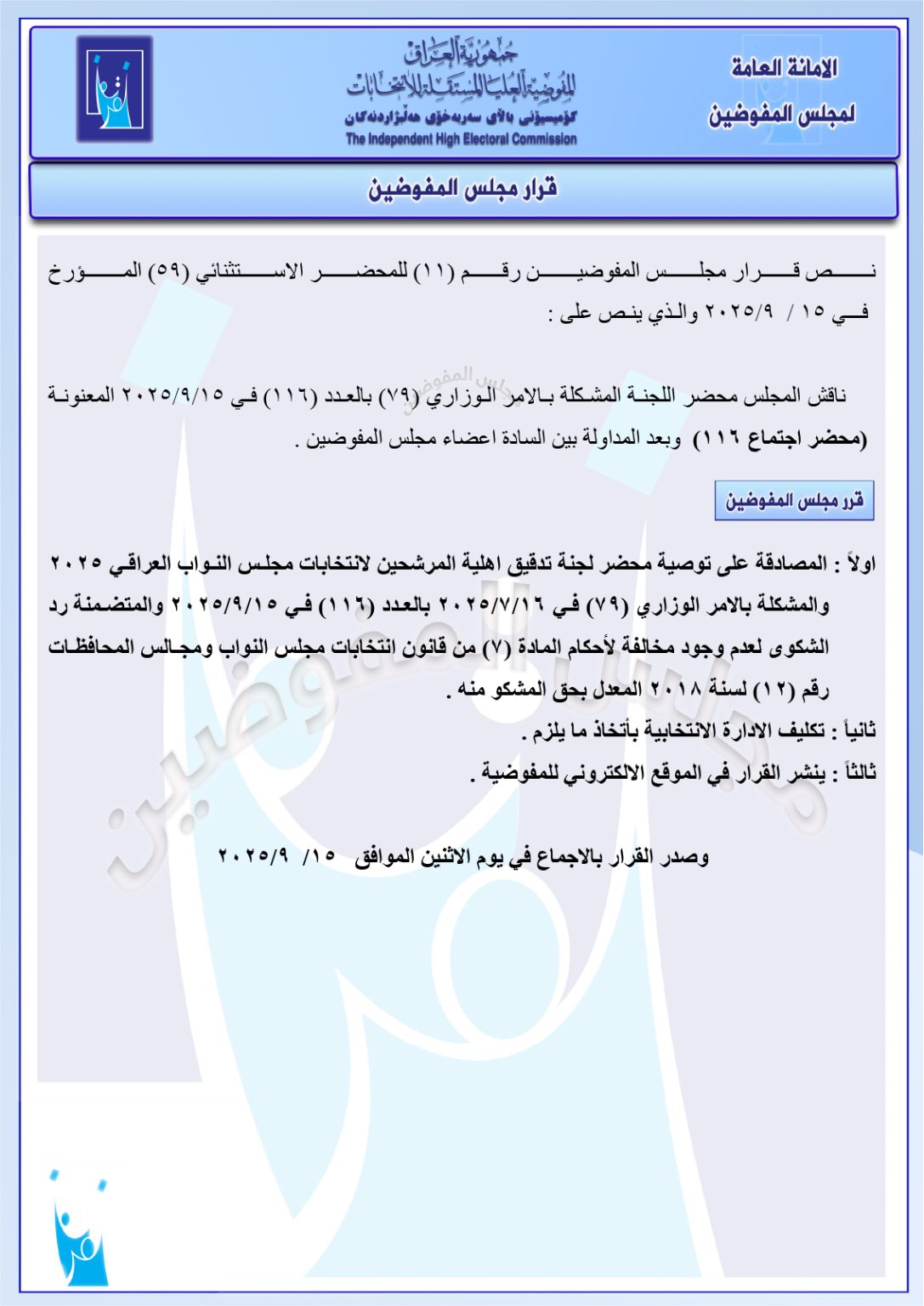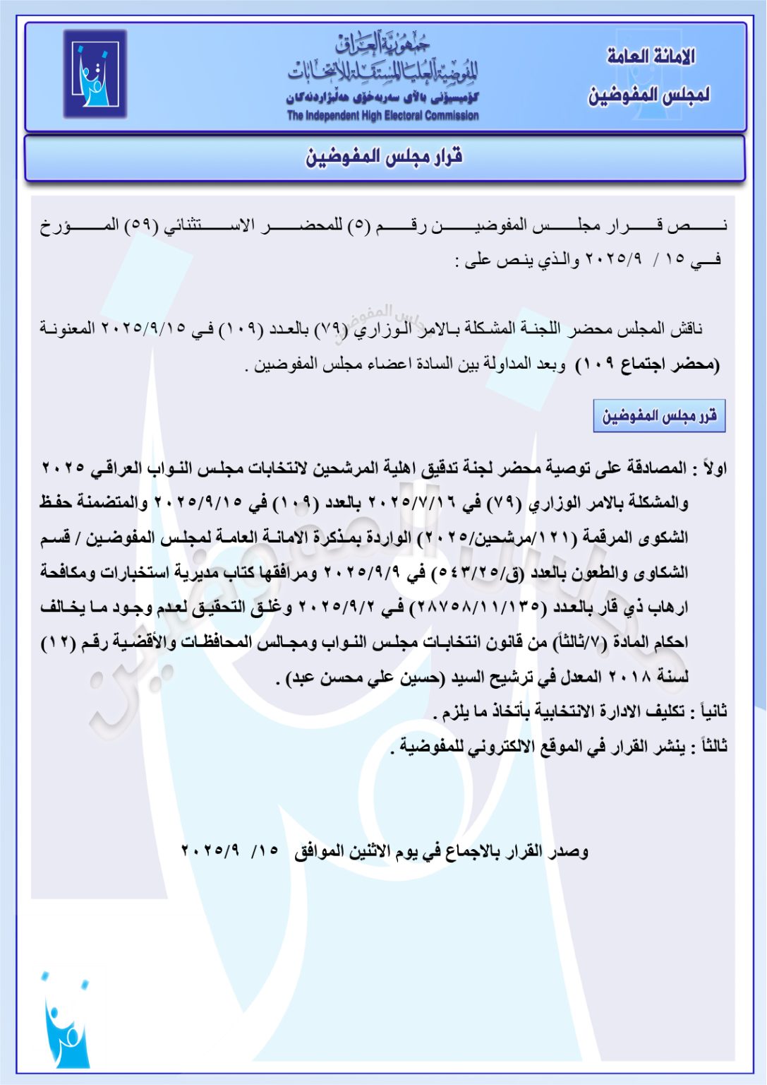 وثائق لمجلس المفوضين: قرارات جديدة تخص مجموعة من المرشحين للانتخابات النيابية المقبلة تتضمن 14 رداً على مجموعة من الإخبارات والشكاوى