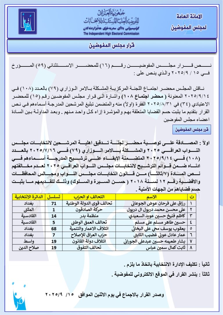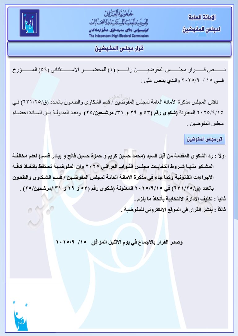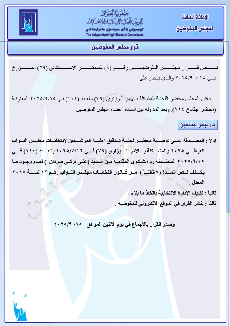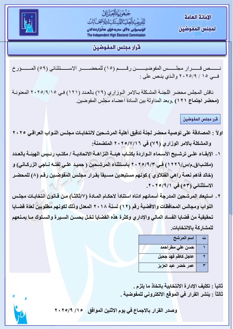وثائق: جميع قرارات مجلس المفوضين الصادرة في 15 أيلول.. رد شكاوى وإبقاء على أسماء مرشحين