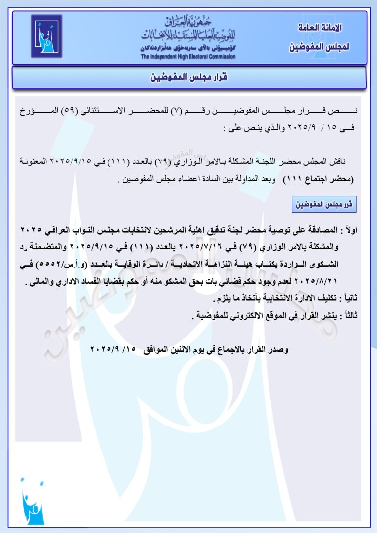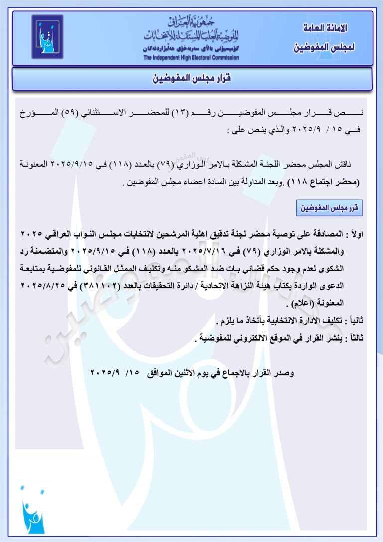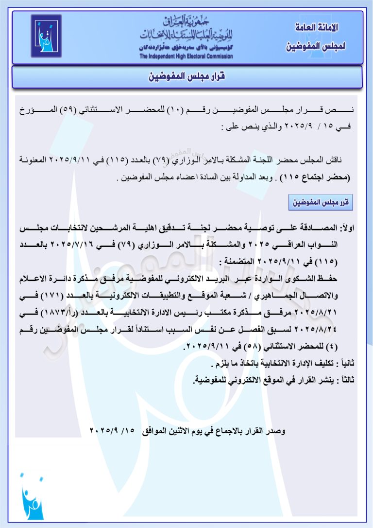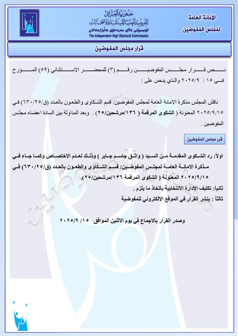 وثائق: جميع قرارات مجلس المفوضين الصادرة في 15 أيلول.. رد شكاوى وإبقاء على أسماء مرشحين