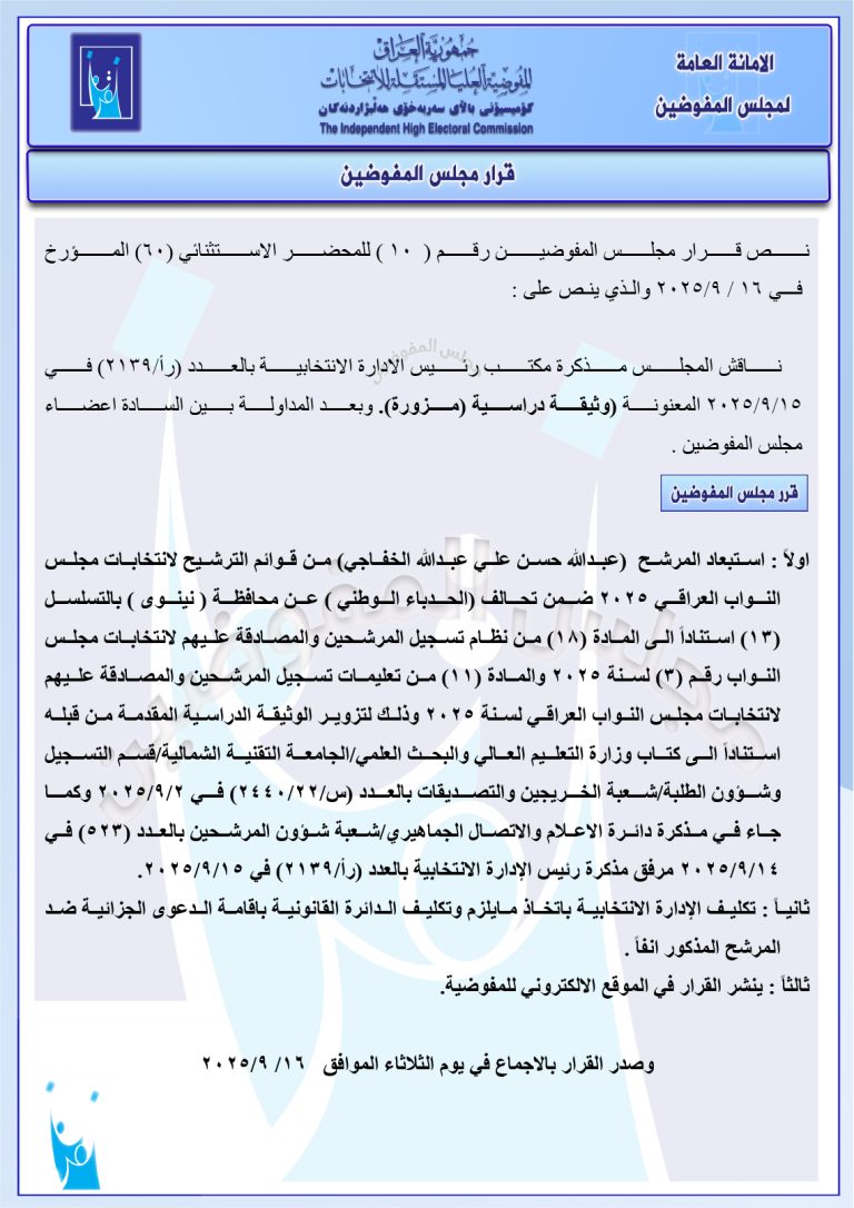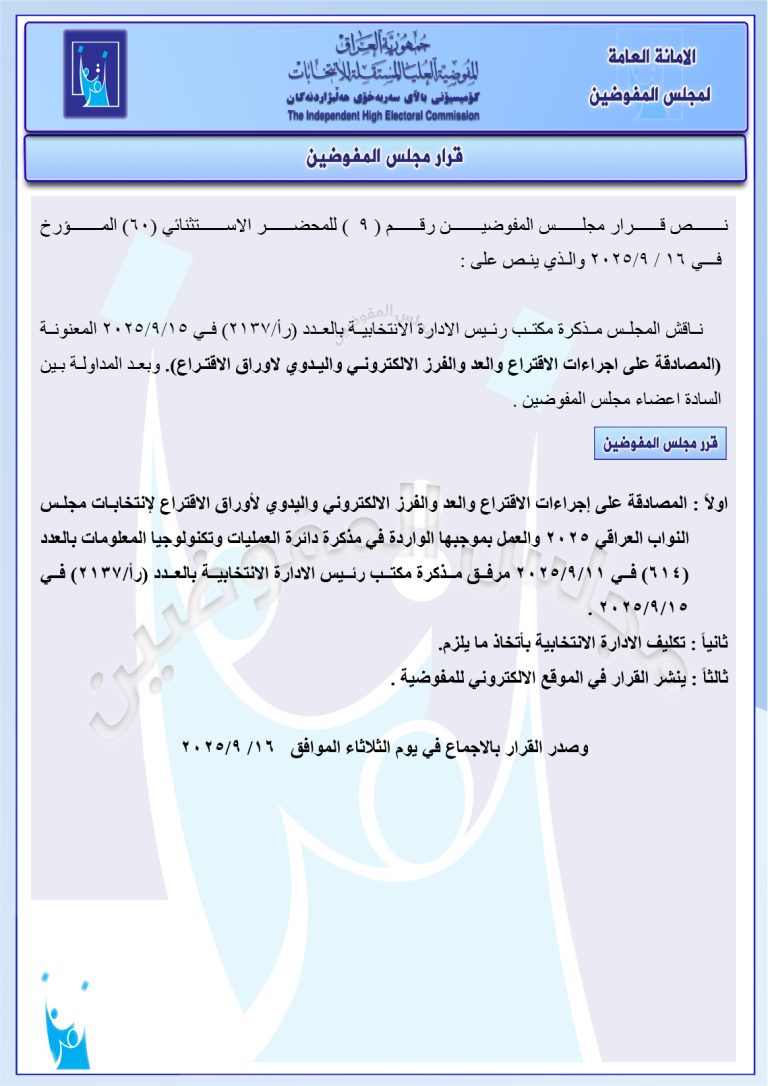 وثائق: قرارات مجلس المفوضين الصادرة بتاريخ 16 أيلول.. تتضمن استبعاد مرشح ورد شكاوى آخرين المصادقة على إجراءات خاصة بالاقتراع