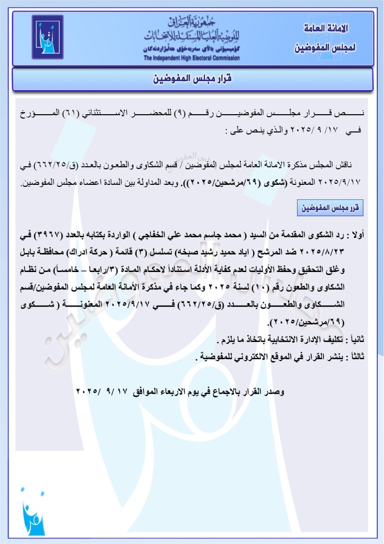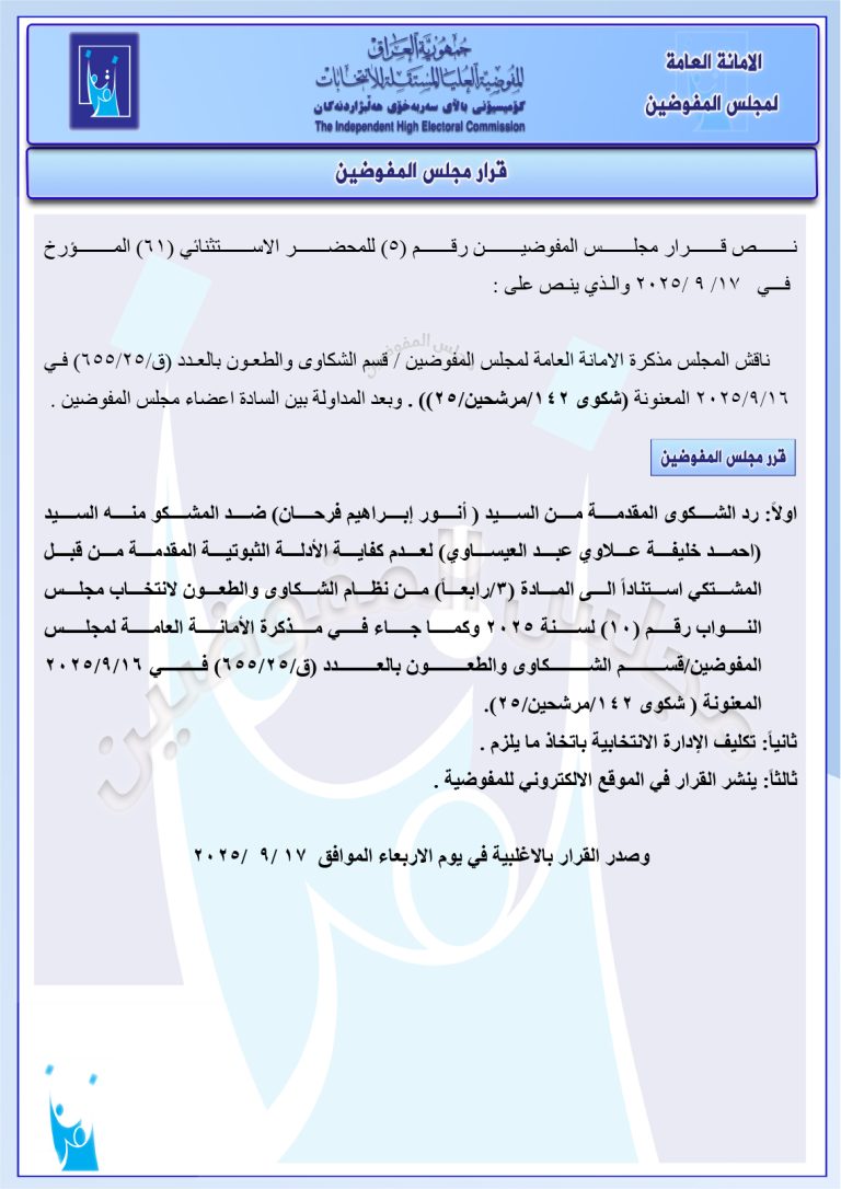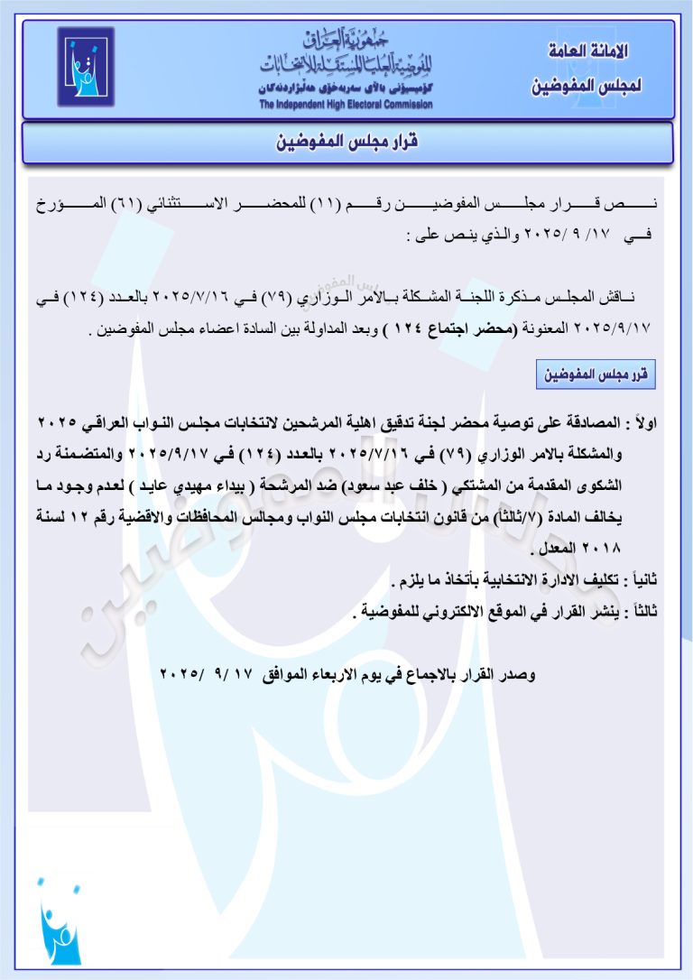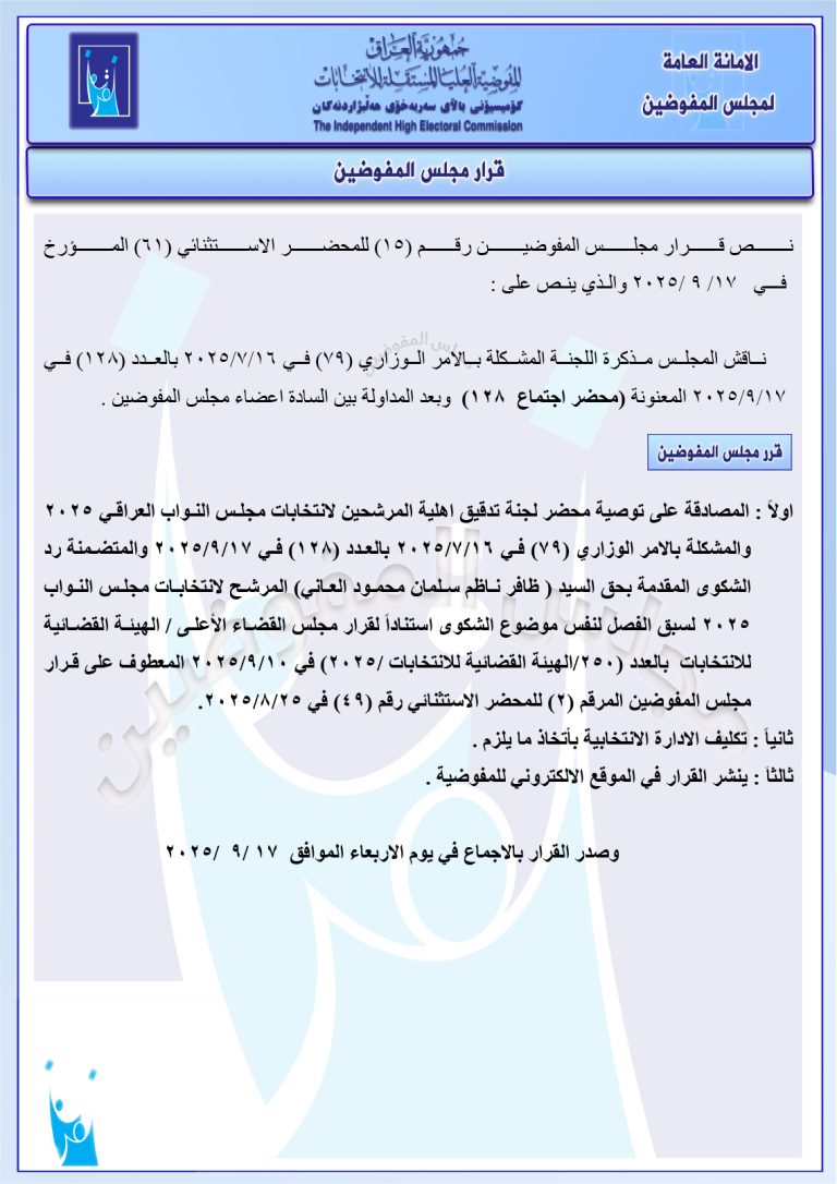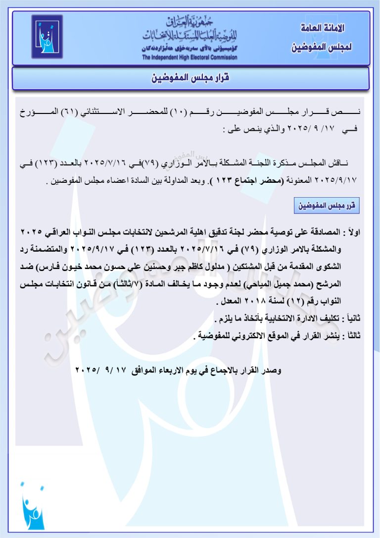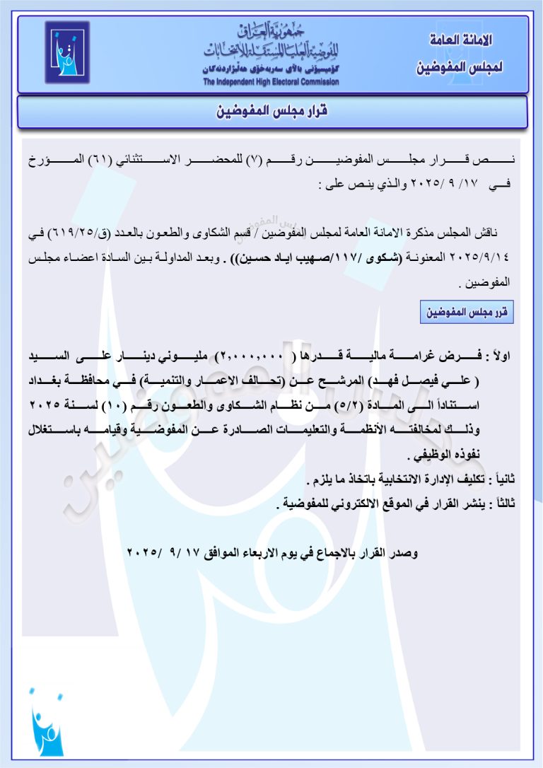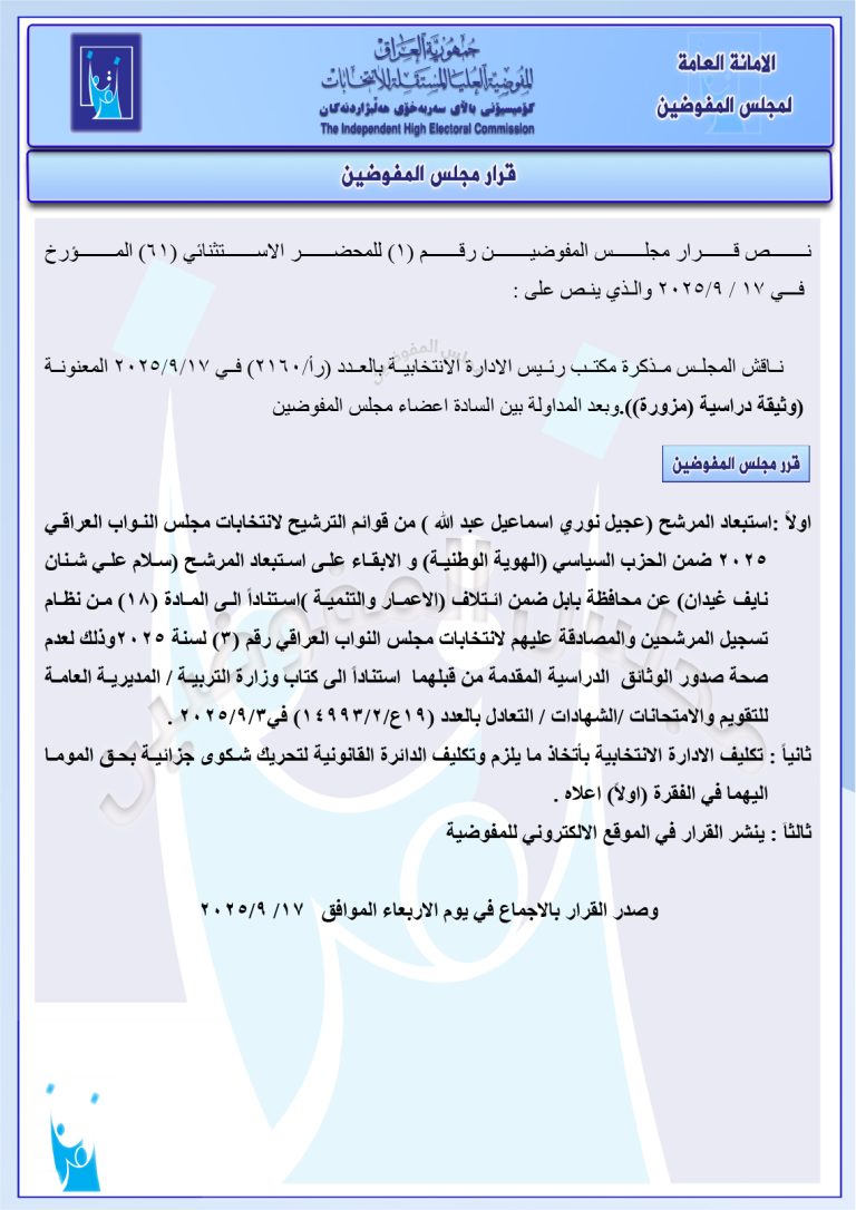 مجلس المفوضين يقرر استبعاد مرشح والإبقاء على استبعاد آخر.. ويغرم مرشح بمبلغ 2 مليون دينار مجموعة وثائق جديدة صادرة عن المجلس