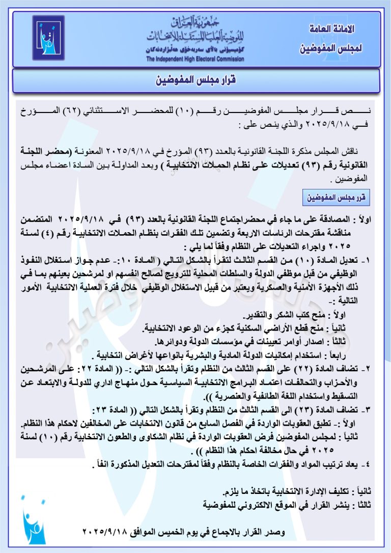 وثيقة: مجلس المفوضين يعدل نظام الحملات الانتخابية لمنع استغلال المرشحين للنفوذ الوظيفي
