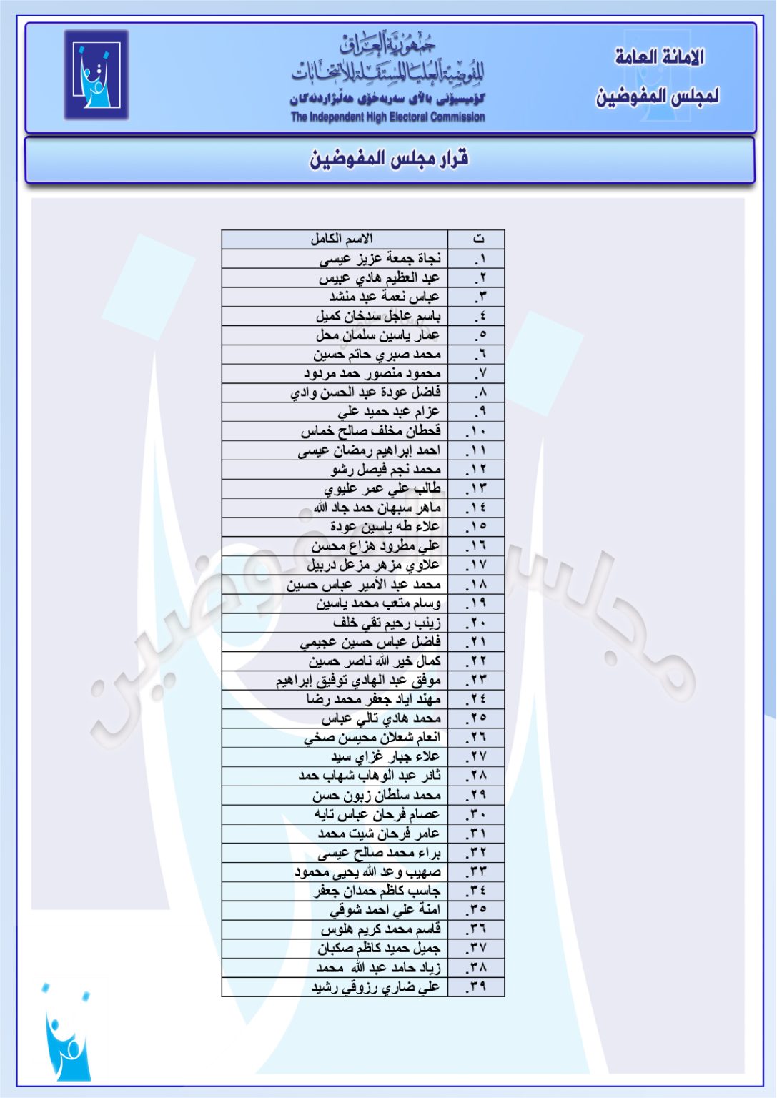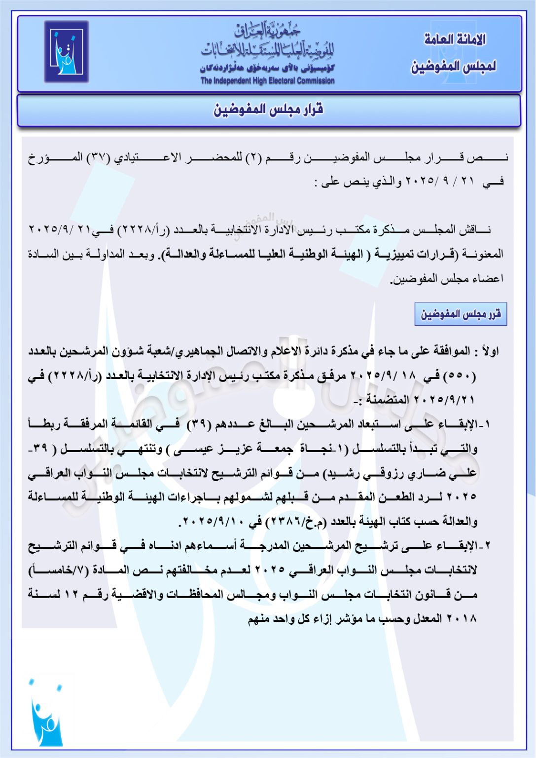 قرارات جديدة لمجلس المفوضين: الإبقاء على استبعاد 39 مرشحاً وإبقاء ترشيح 4 آخرين (وثائق)