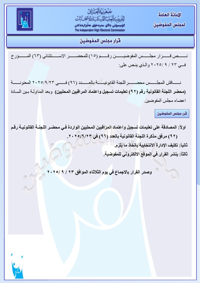 وثائق: مجلس المفوضين يصادق على تعليمات اعتماد وكلاء الأحزاب والمراقبين المحليين