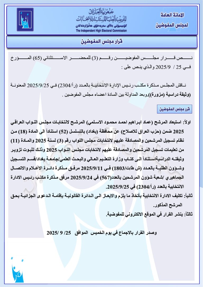 مجلس المفوضين يقرر استبعاد 20 مرشحاً من الانتخابات لتزوير وثيقة وشمولهم بإجراءات المساءلة