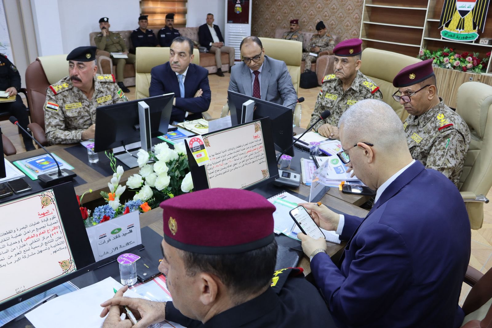وناقش المجتمعون آخر الاستعدادات الجارية لحماية العملية الانتخابية وتوفير بيئة انتخابية آمنة وأجواء مستقرة و العمل على حماية المراكز الانتخابية ومخازن المحافظة وآلية توزيع المواد اللوجستية وإعادتها بعد يوم الاقتراع”.