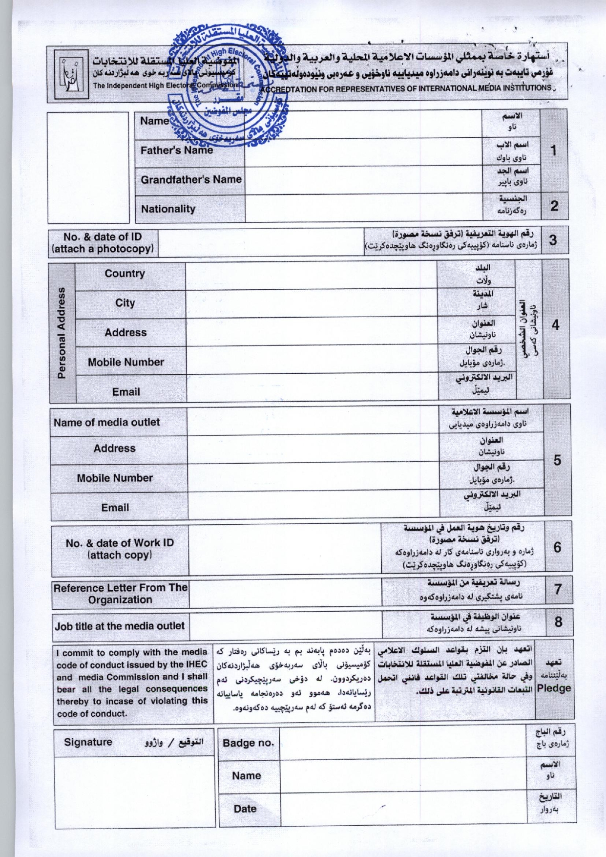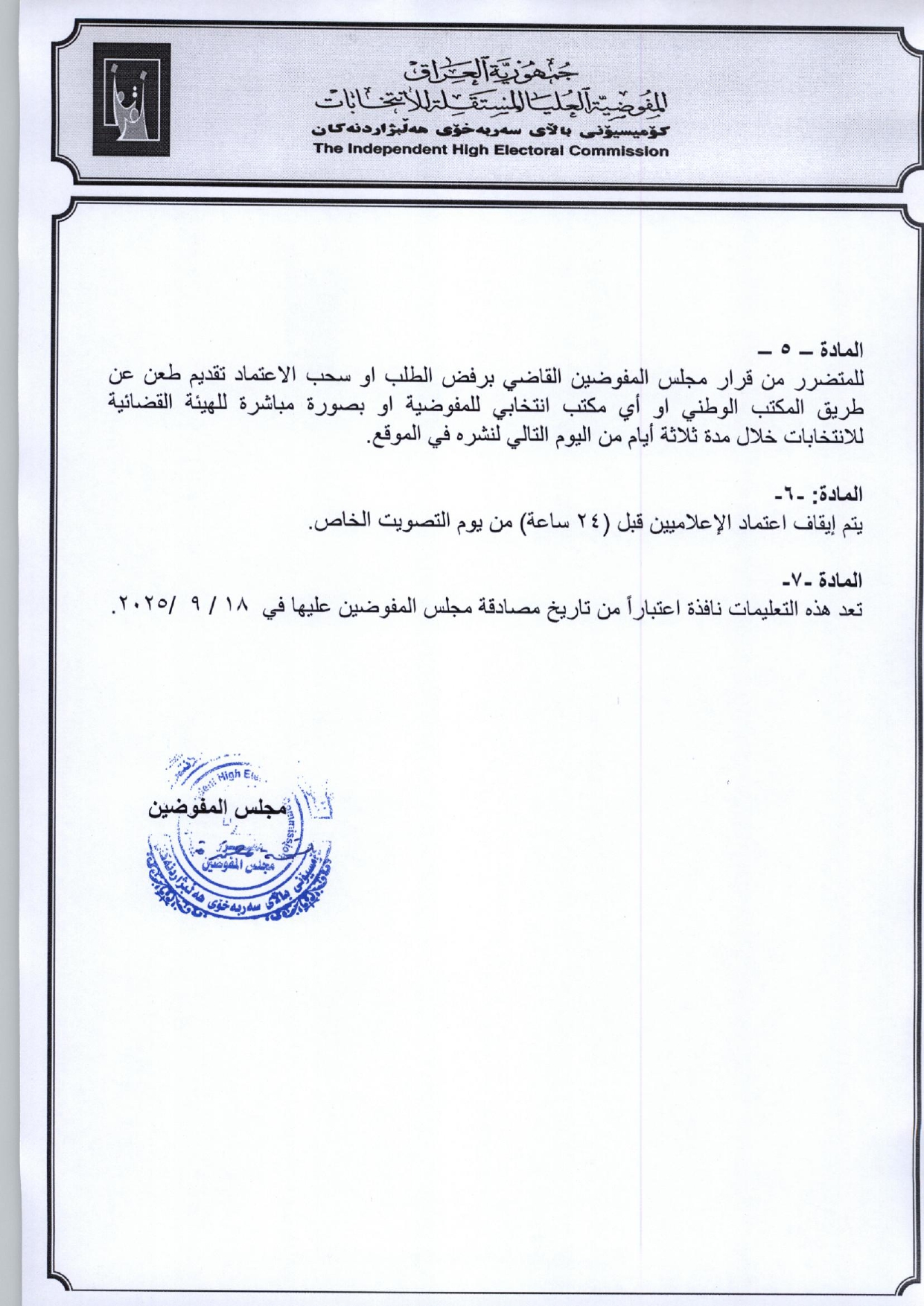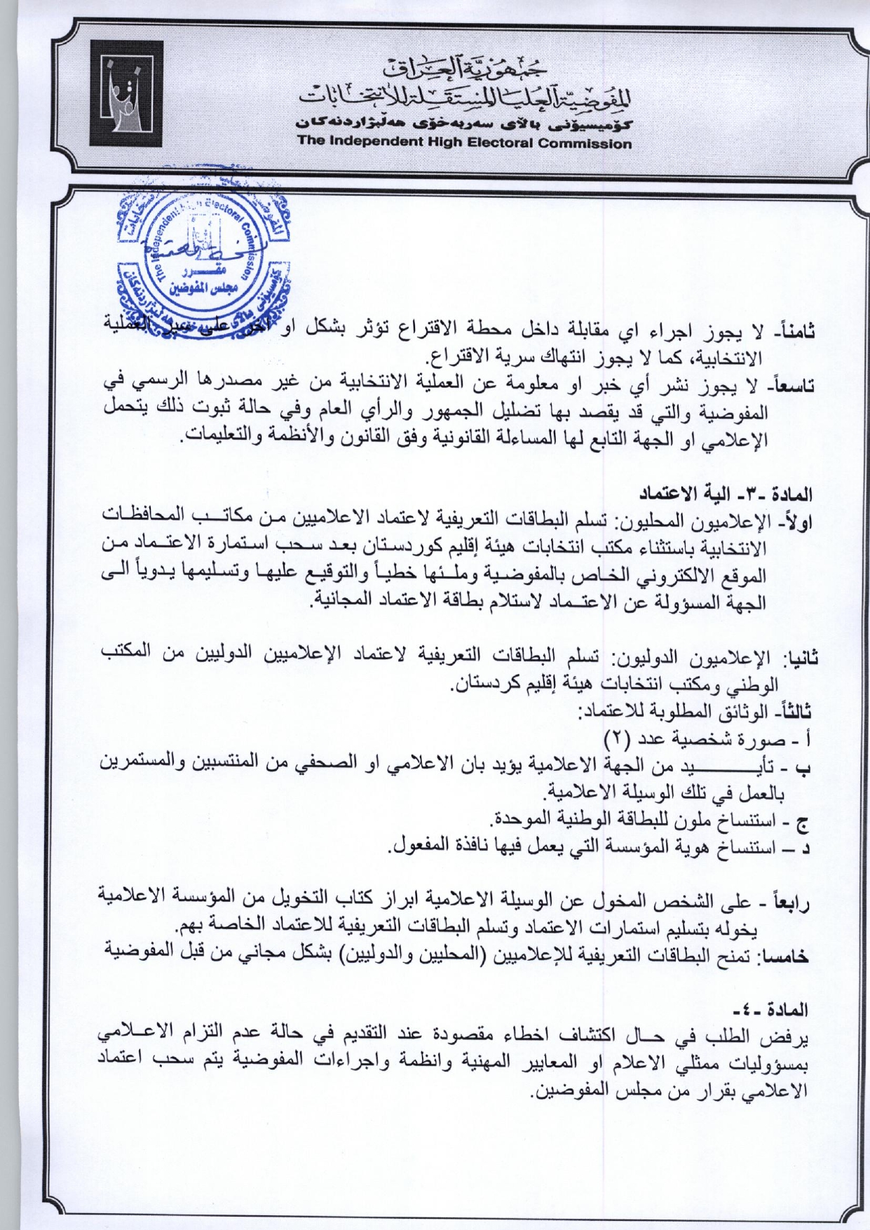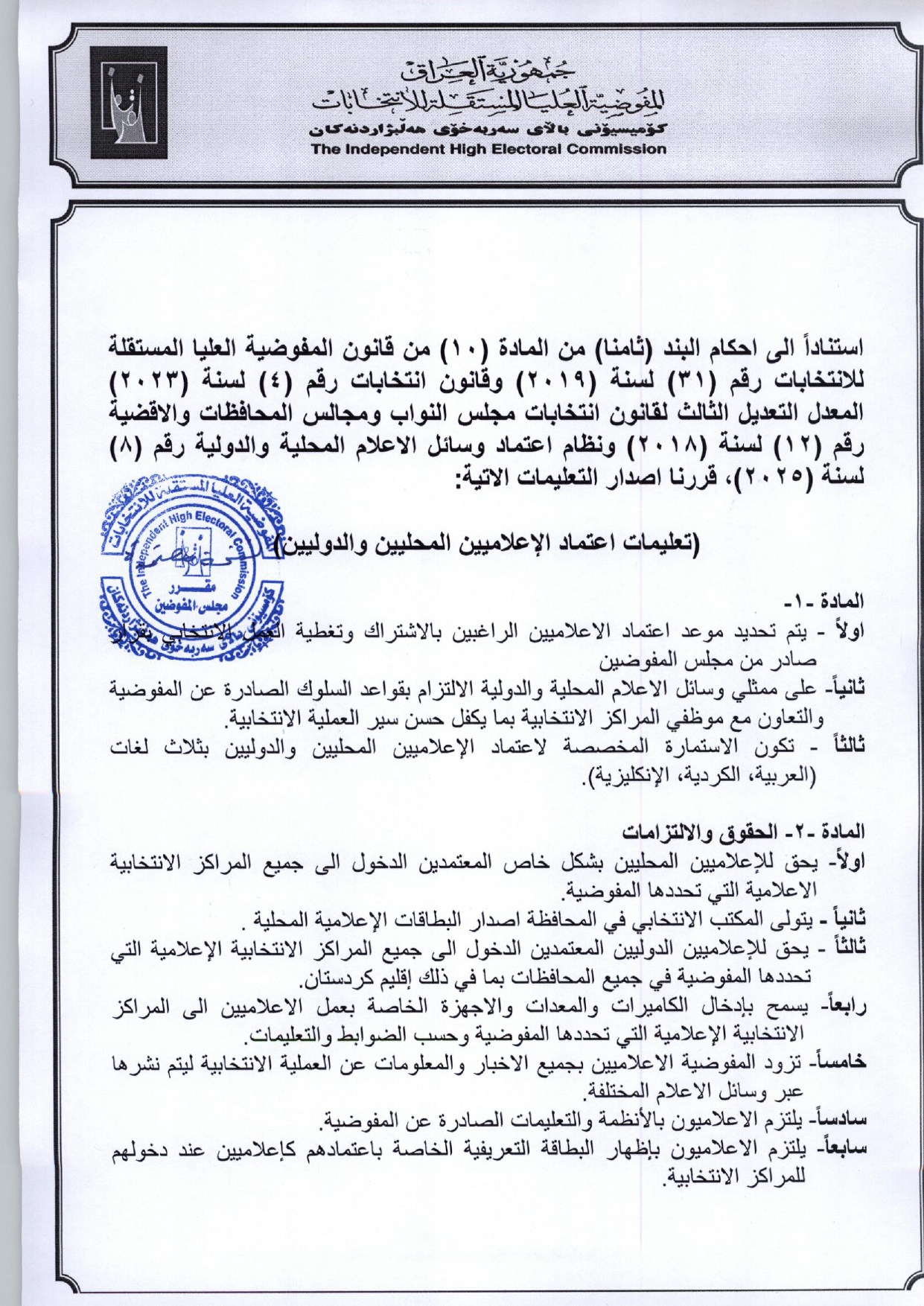 نشرت المفوضية العليا المستقلة للانتخابات، اليوم الثلاثاء، تعليمات اعتماد الاعلاميين المحليين والدوليين، وفقاً لوثائق صادرة عن مجلس المفوضين.