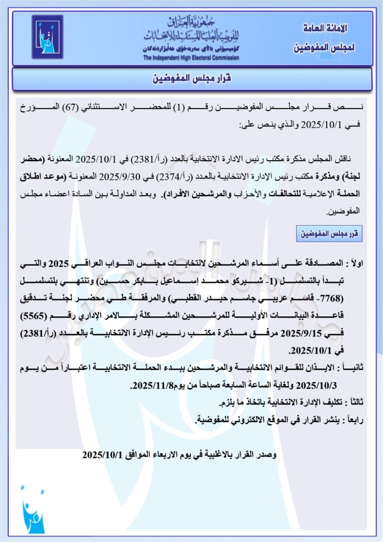وثيقة: المفوضية تنشر قرار مصادقة مجلس المفوضين على أسماء المرشحين للانتخابات المقبلة