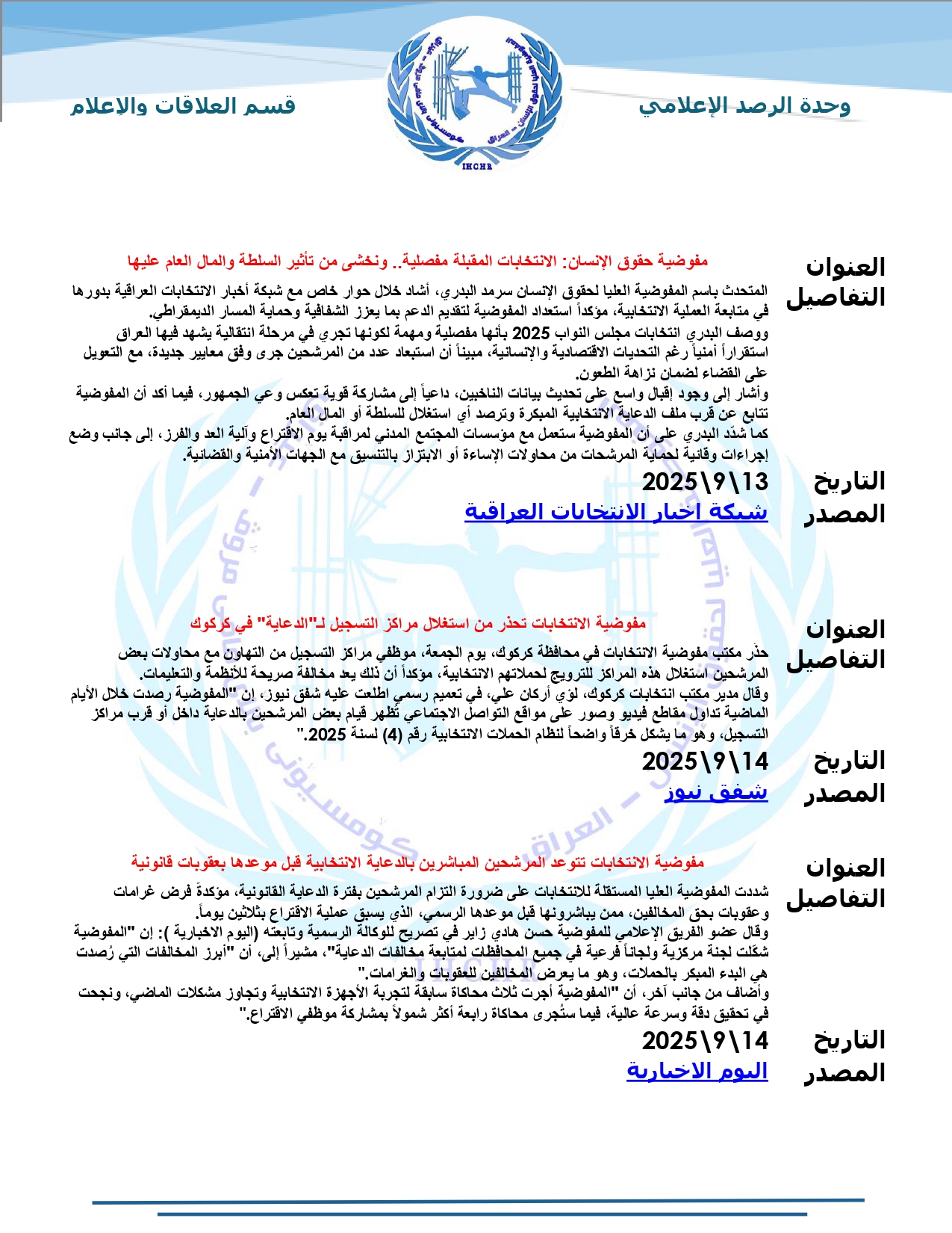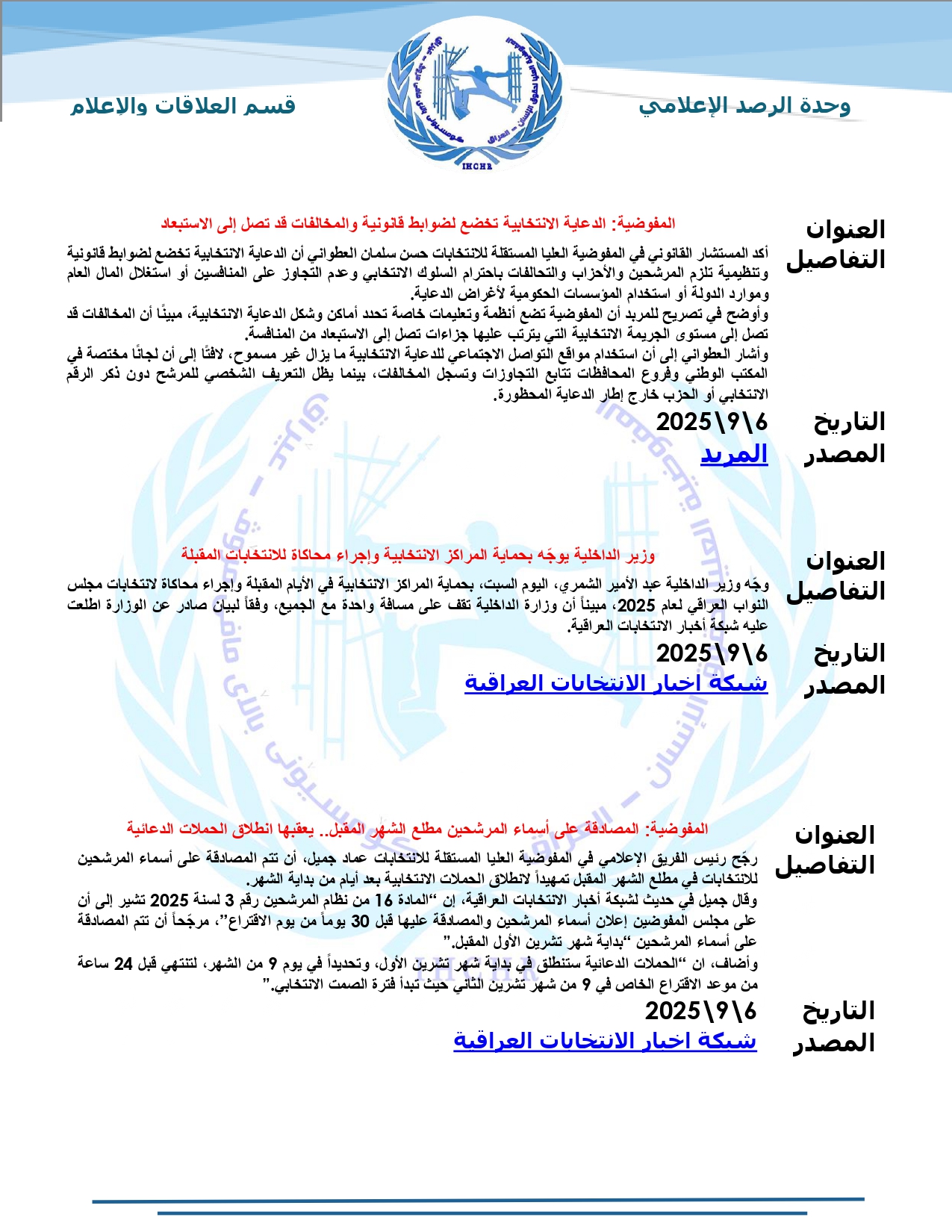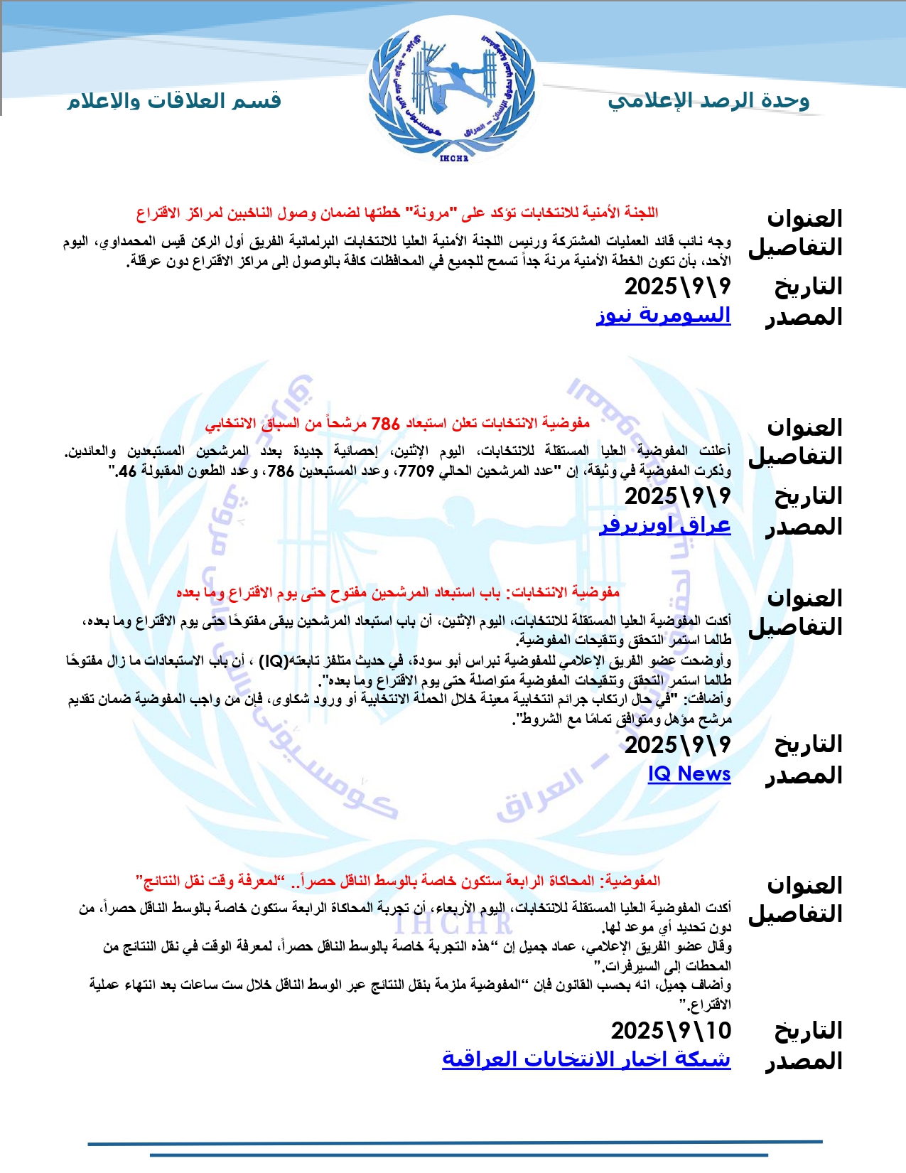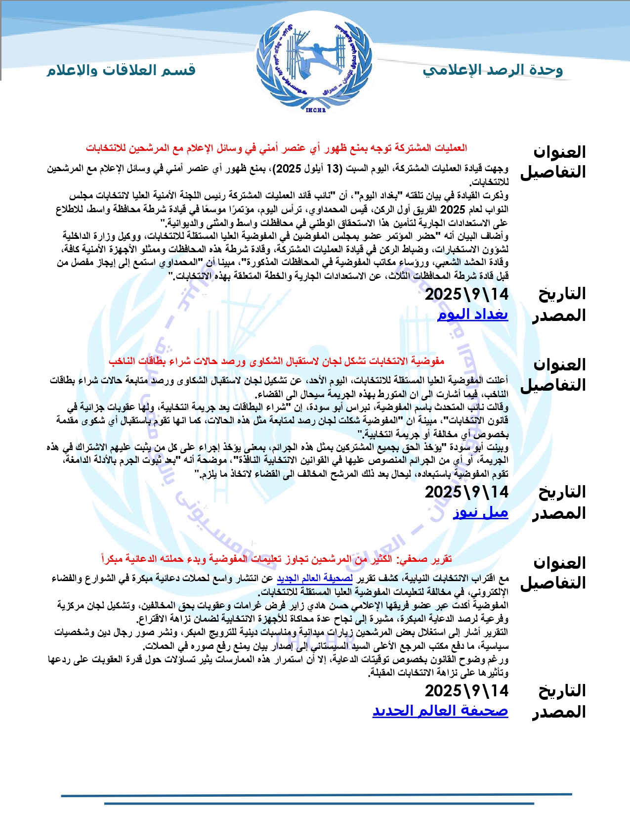 نشرت المفوضية العليا لحقوق الإنسان – العراق، تقرير الرصد الإعلامي للانتخابات لشهر أيلول 2025، حيث تضمّن التقرير أبرز الأخبار المنشورة في المواقع والوكالات المحلية عن الانتخابات النيابية المقبلة، ومن ضمنها شبكة أخبار الانتخابات العراقية.