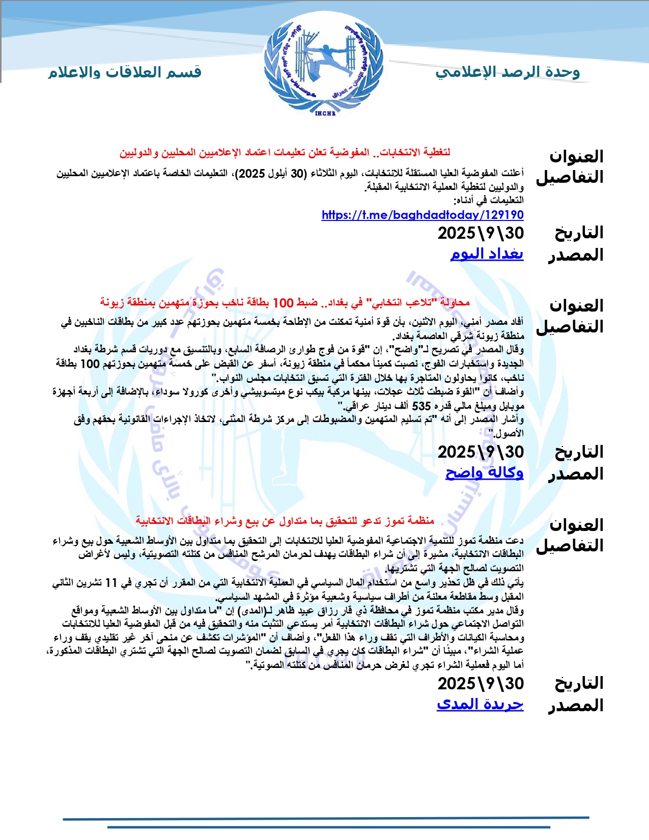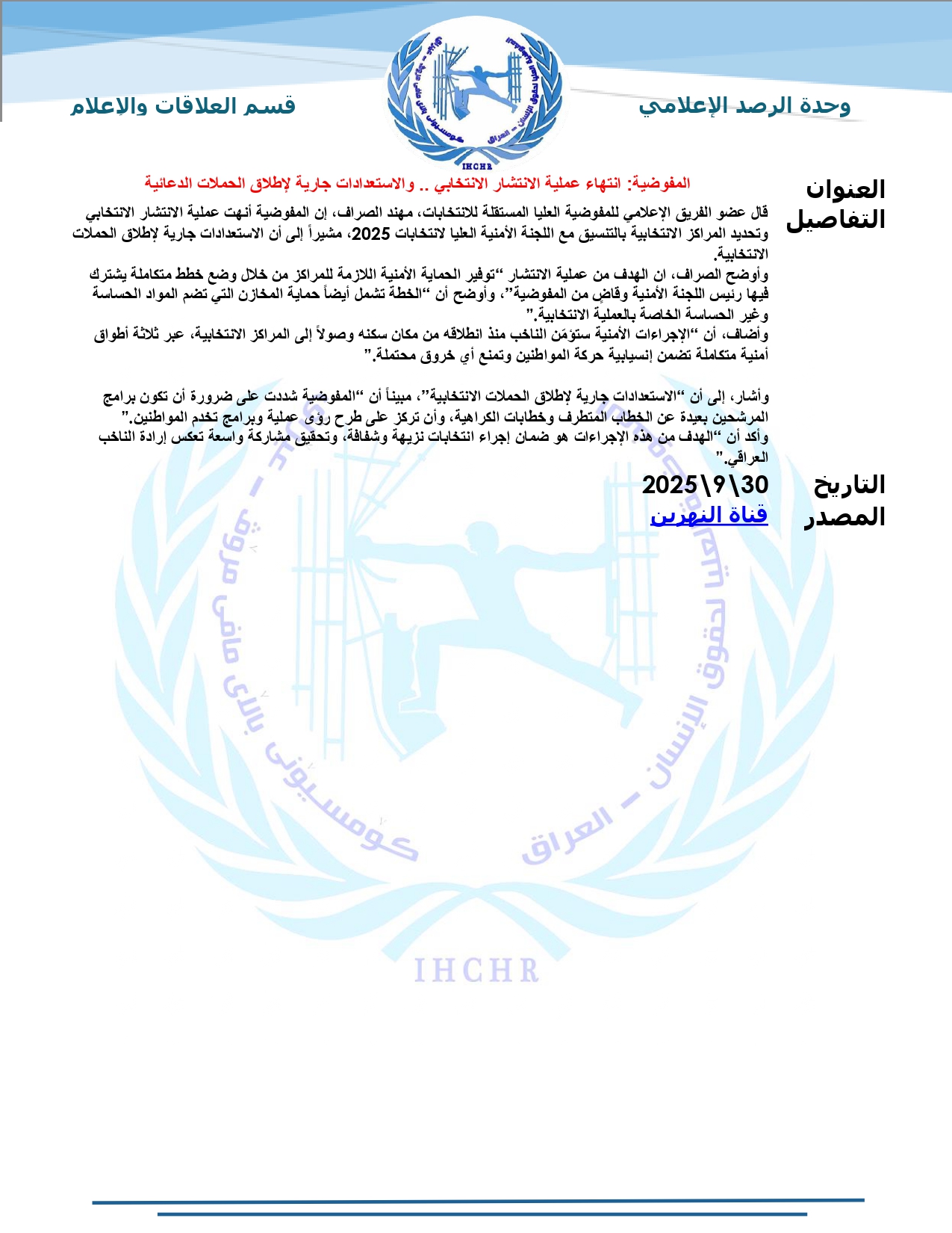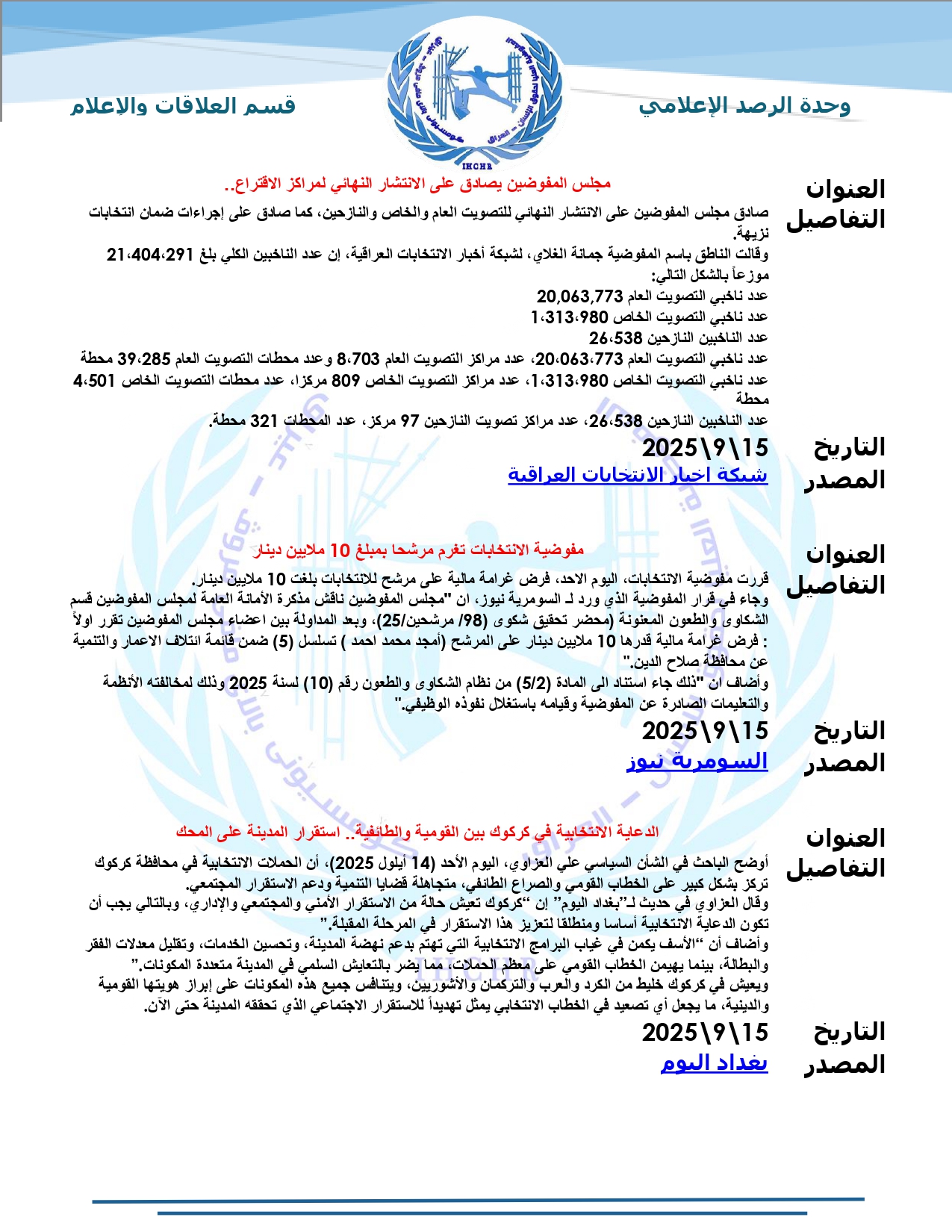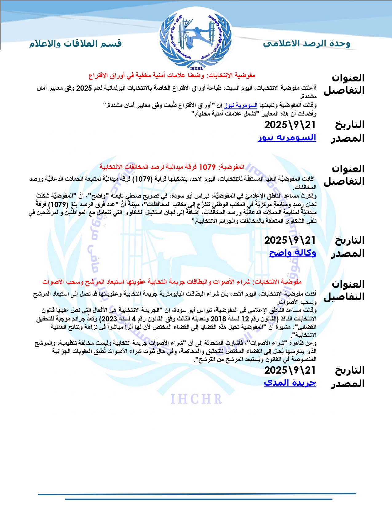 نشرت المفوضية العليا لحقوق الإنسان – العراق، تقرير الرصد الإعلامي للانتخابات لشهر أيلول 2025، حيث تضمّن التقرير أبرز الأخبار المنشورة في المواقع والوكالات المحلية عن الانتخابات النيابية المقبلة، ومن ضمنها شبكة أخبار الانتخابات العراقية.