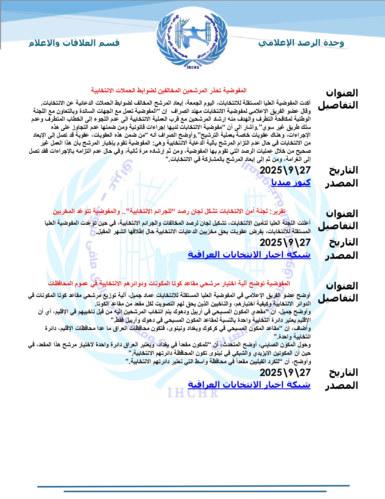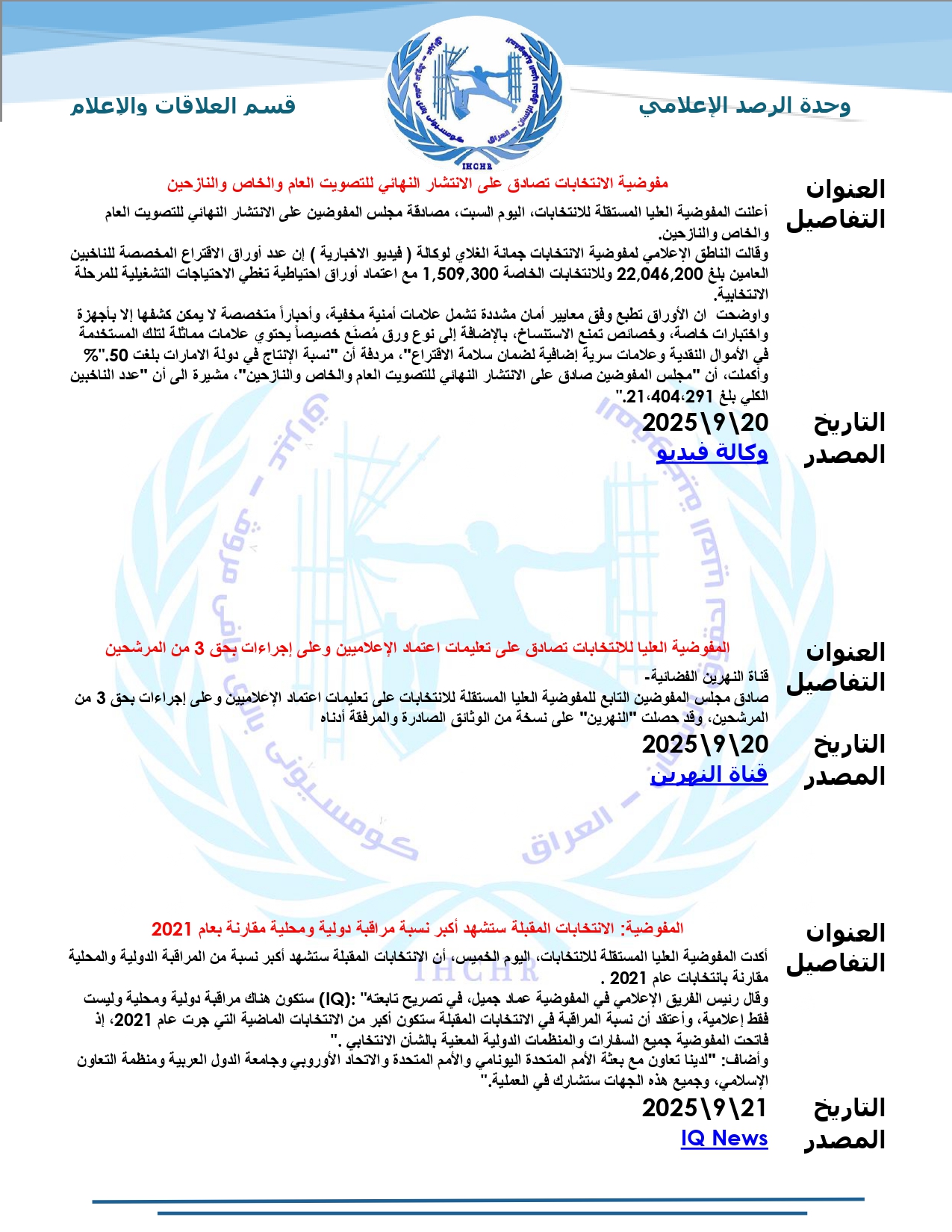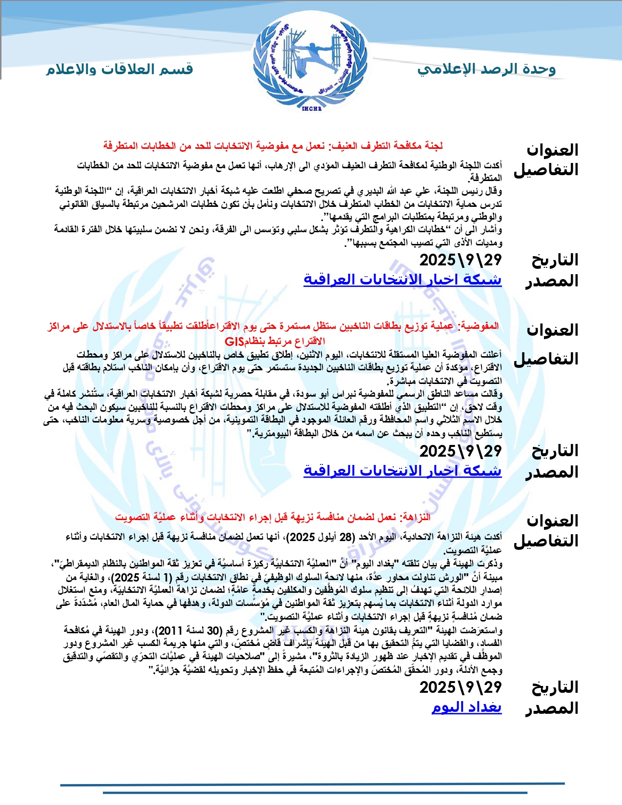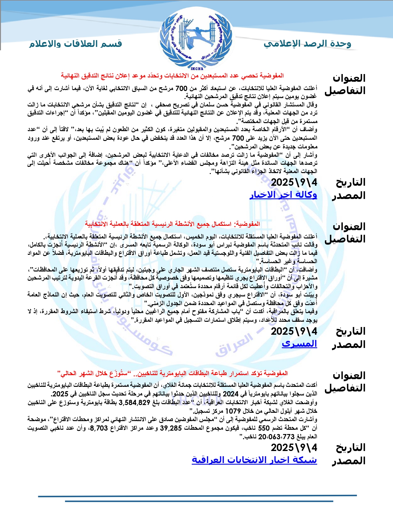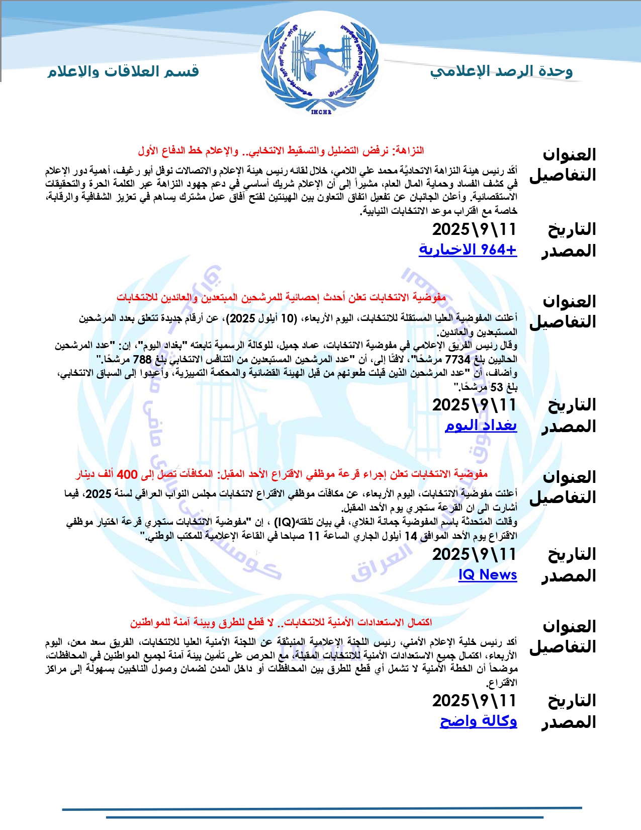نشرت المفوضية العليا لحقوق الإنسان – العراق، تقرير الرصد الإعلامي للانتخابات لشهر أيلول 2025، حيث تضمّن التقرير أبرز الأخبار المنشورة في المواقع والوكالات المحلية عن الانتخابات النيابية المقبلة، ومن ضمنها شبكة أخبار الانتخابات العراقية.