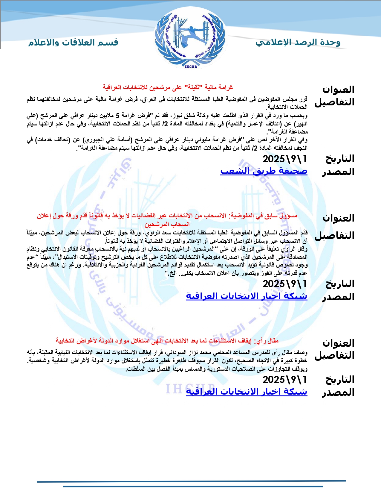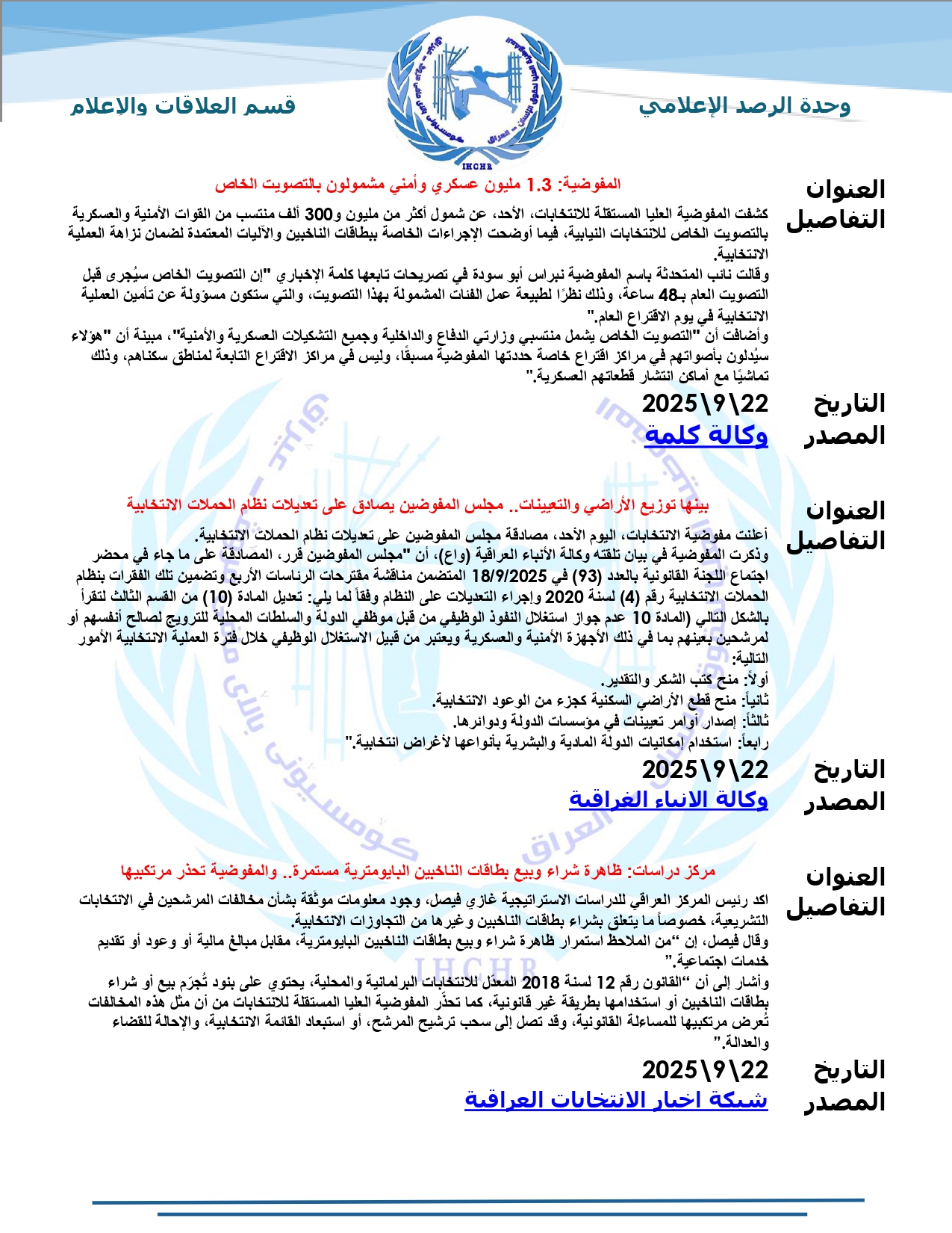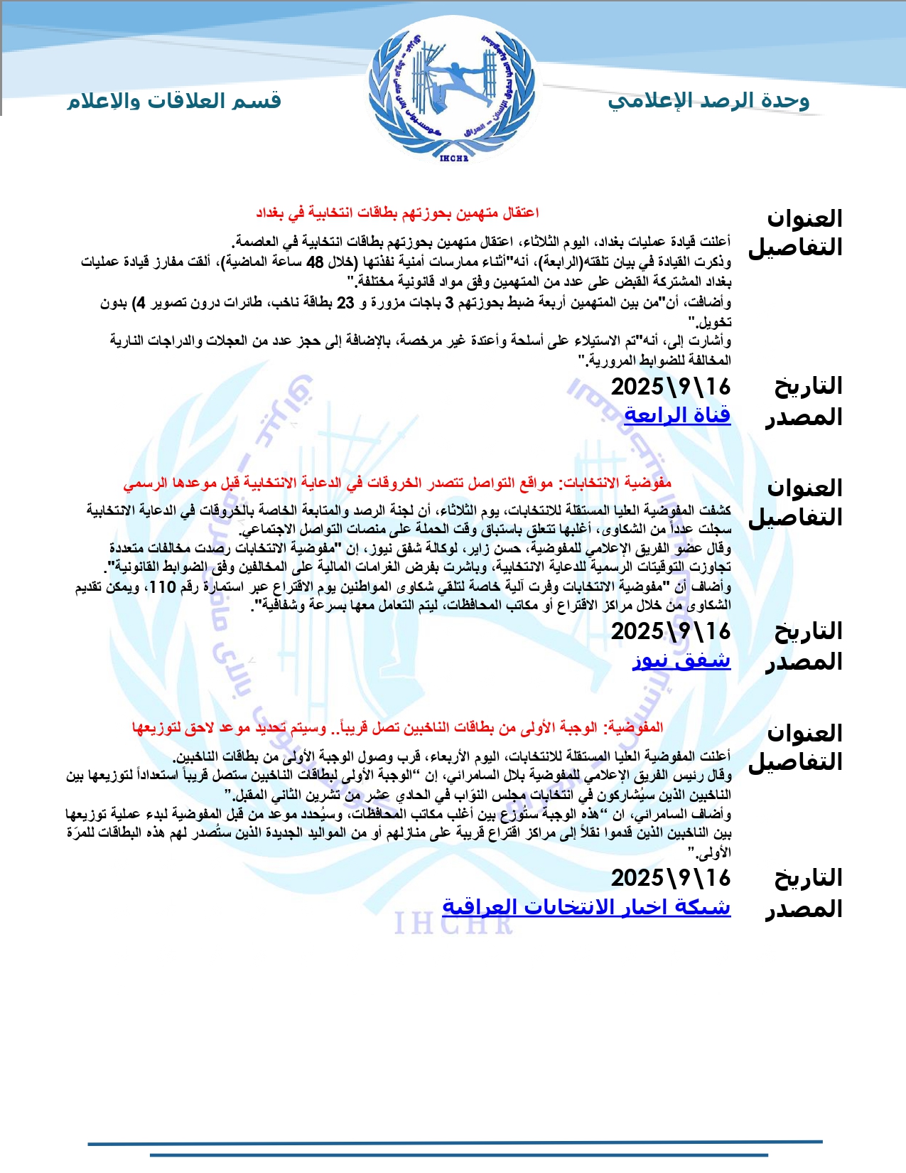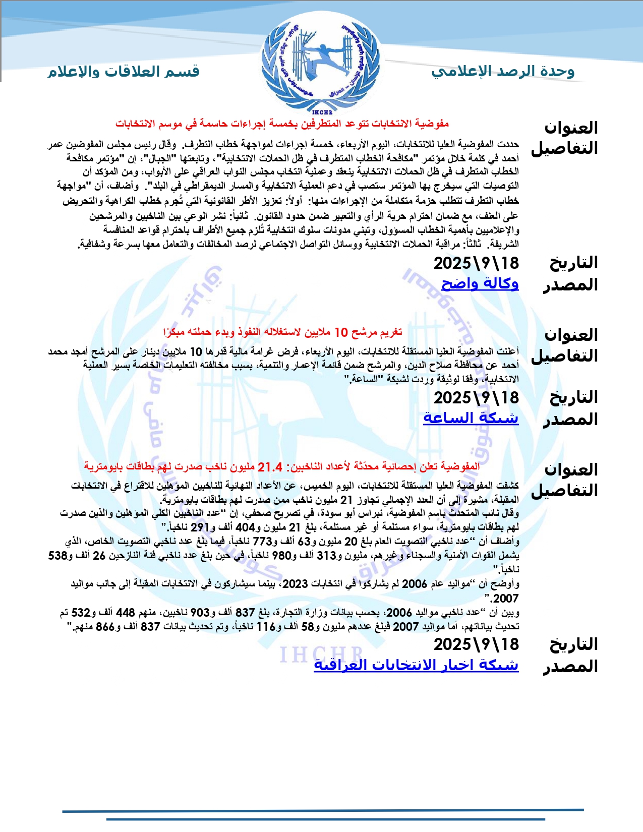 نشرت المفوضية العليا لحقوق الإنسان – العراق، تقرير الرصد الإعلامي للانتخابات لشهر أيلول 2025، حيث تضمّن التقرير أبرز الأخبار المنشورة في المواقع والوكالات المحلية عن الانتخابات النيابية المقبلة، ومن ضمنها شبكة أخبار الانتخابات العراقية.