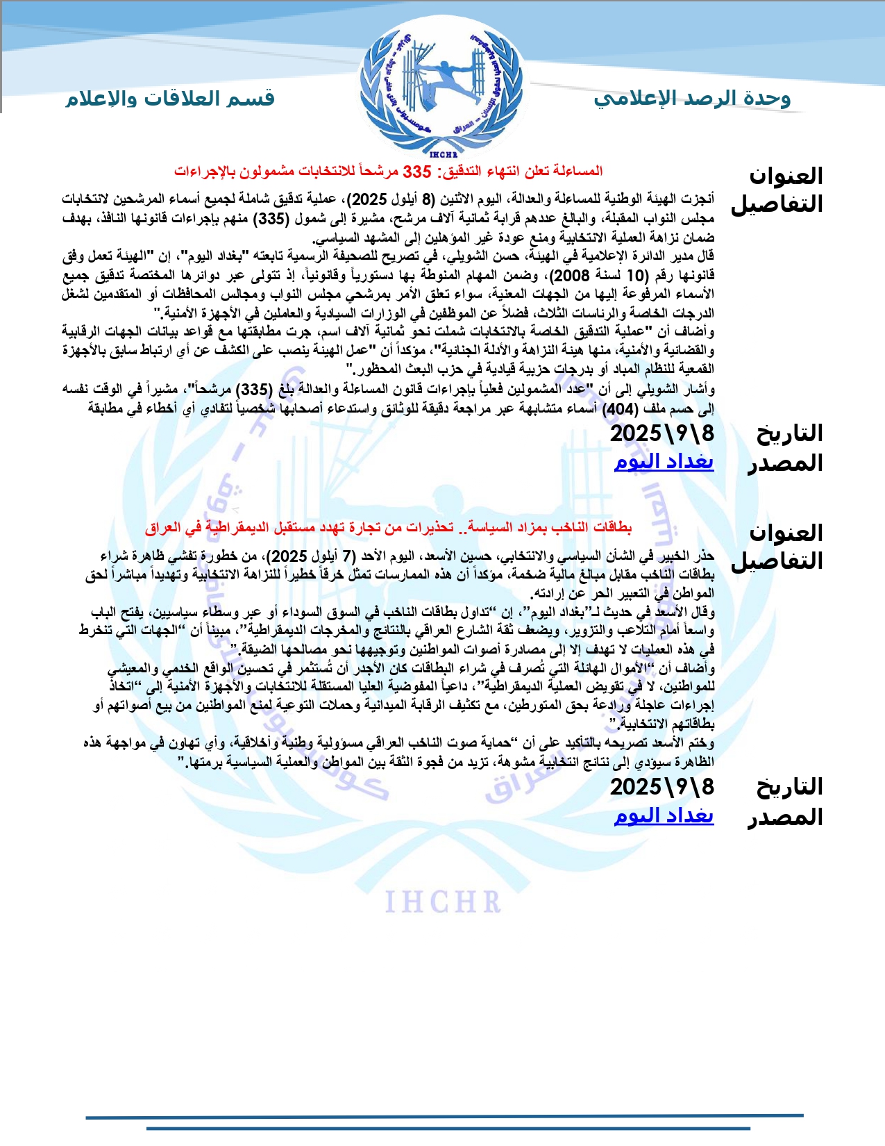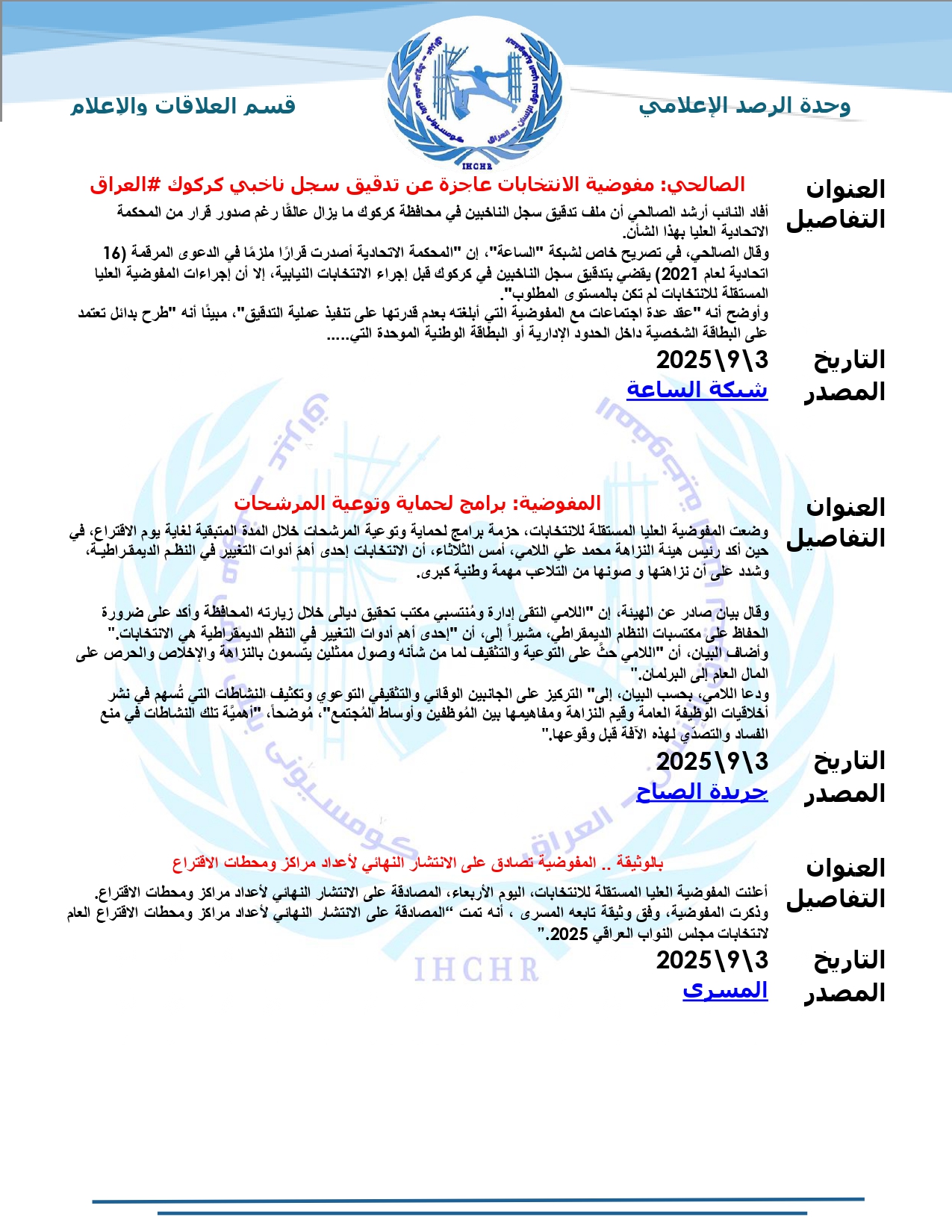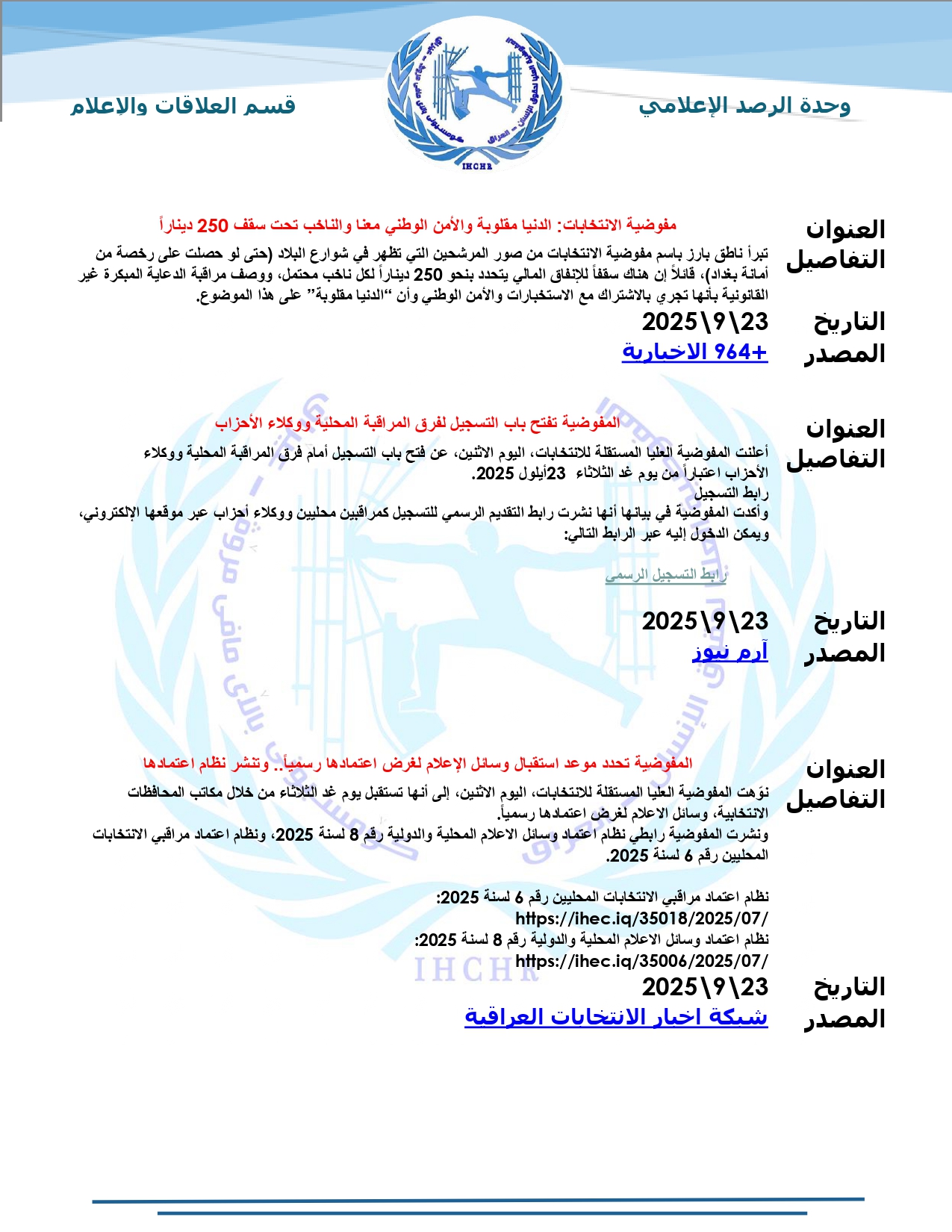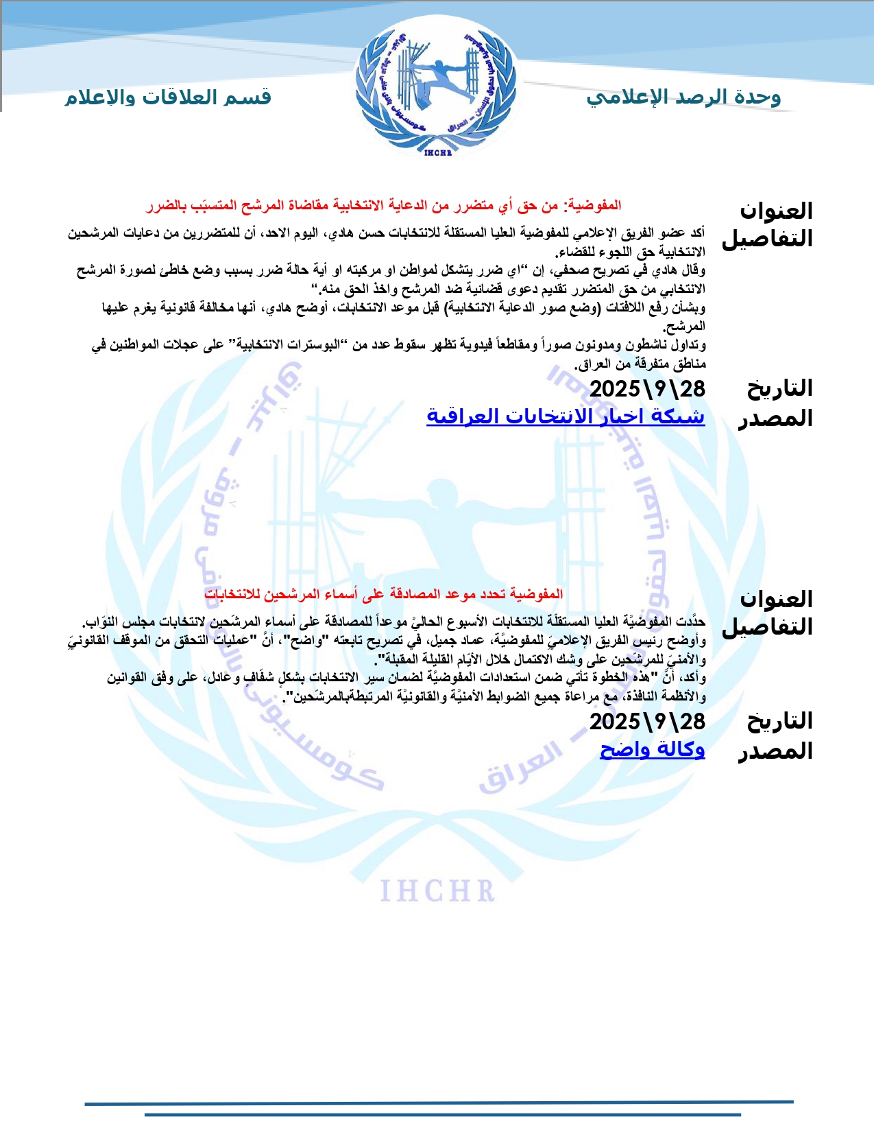 نشرت المفوضية العليا لحقوق الإنسان – العراق، تقرير الرصد الإعلامي للانتخابات لشهر أيلول 2025، حيث تضمّن التقرير أبرز الأخبار المنشورة في المواقع والوكالات المحلية عن الانتخابات النيابية المقبلة، ومن ضمنها شبكة أخبار الانتخابات العراقية.