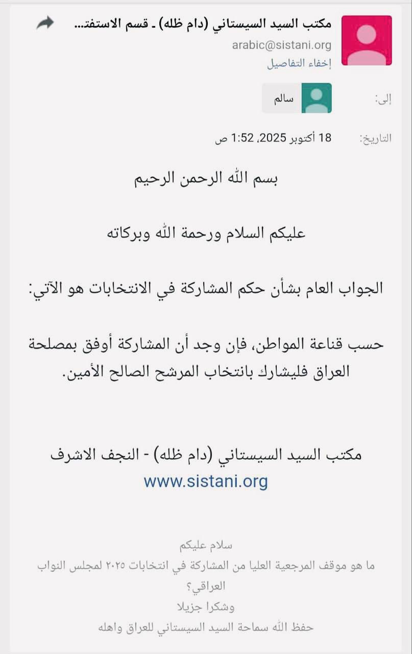 أجاب المرجع الديني السيد علي السيستاني، على سؤال من أحد مقلّديه حول المشاركة في الانتخابات النيابية المقبلة، مؤكداً أن خيار المشاركة في الانتخابات خاضع لقناعة الشخص نفسه.