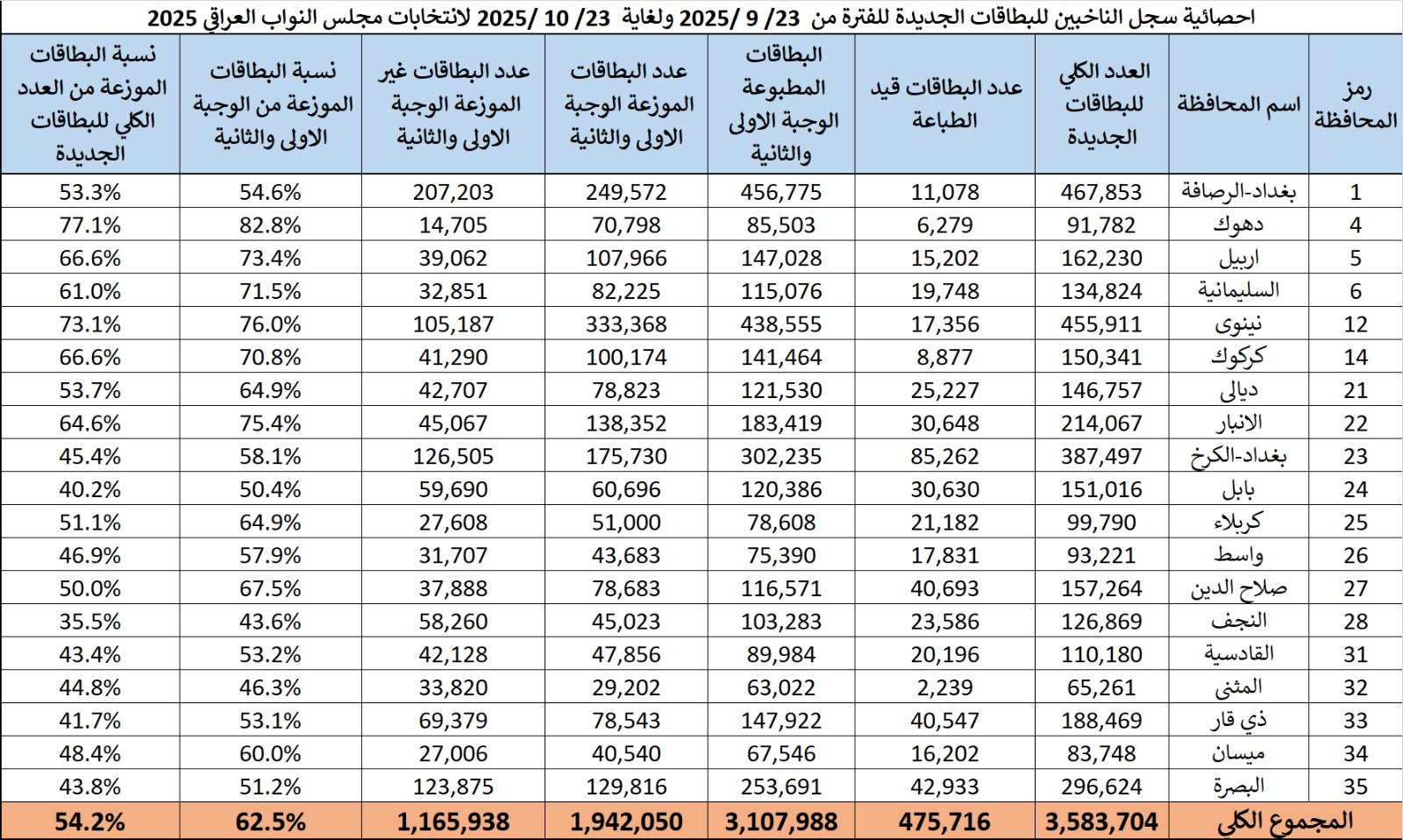 المفوضية تنشر إحصائية سجل الناخبين للبطاقات الجديدة حتى 23/10.. تجاوزت 54% من العدد الكلي