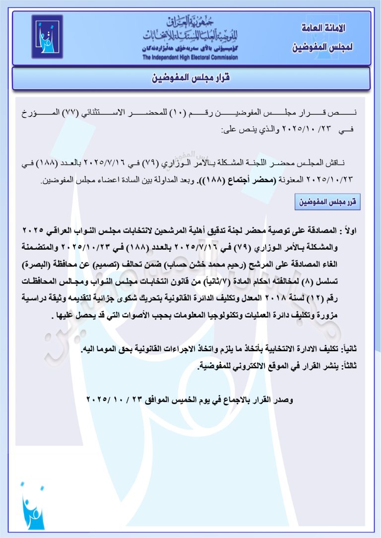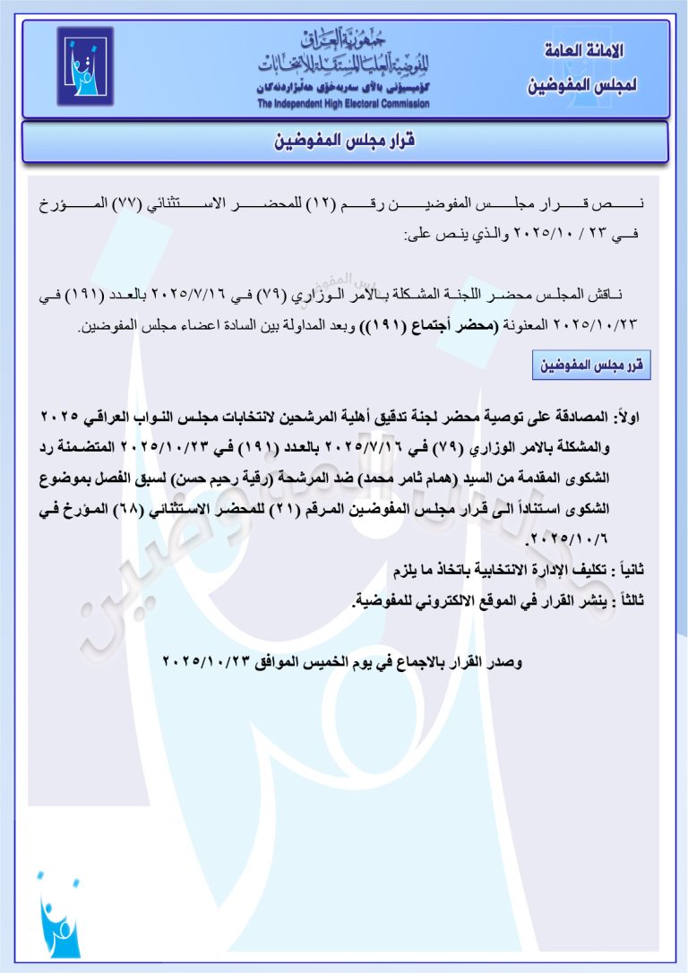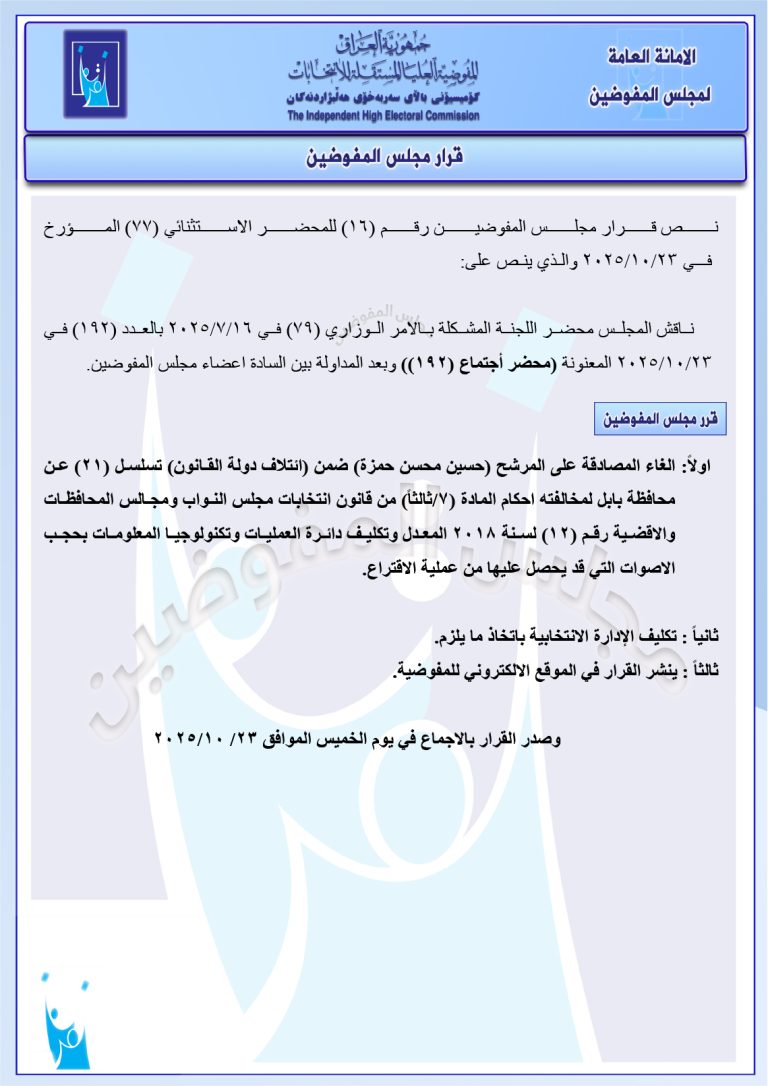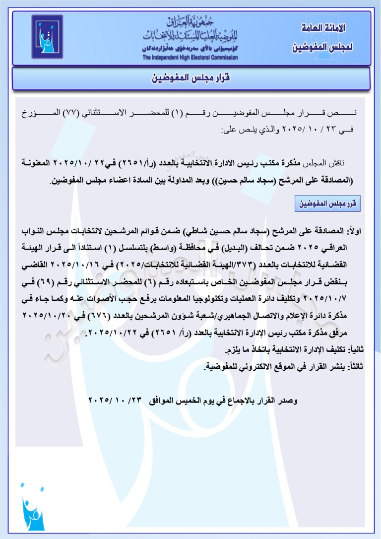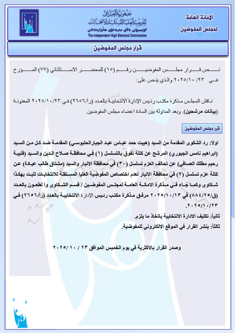 نشرت المفوضية العليا المستقلة للانتخابات، وثائق جديدة تتضمن قرارات لمجلس المفوضين حول عدد من المرشحين.