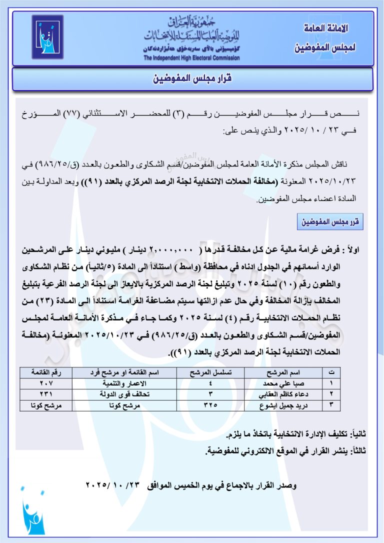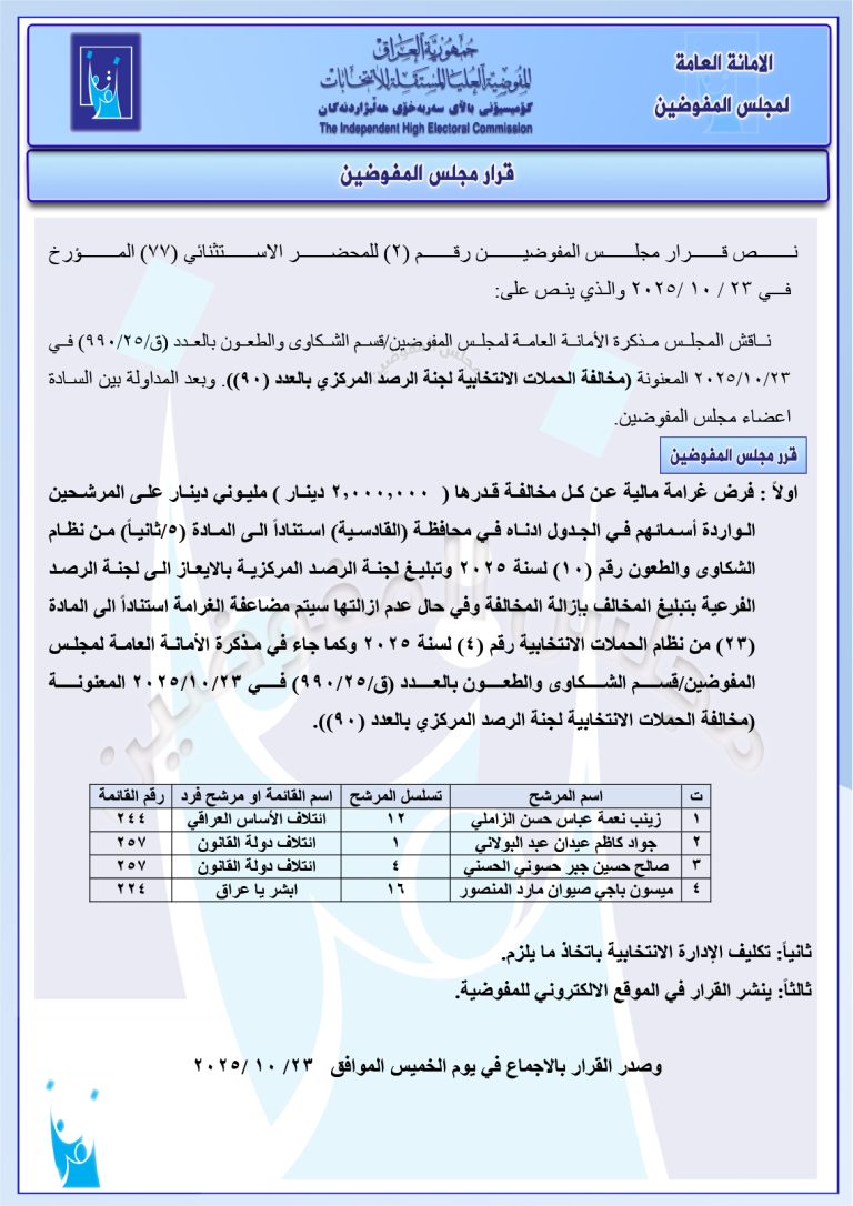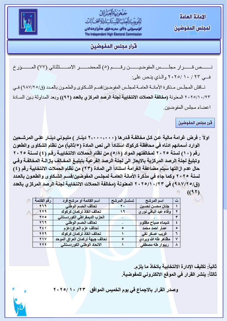 في حين تضمنت القرارات الجديدة رد عدد من الشكاوى وفرض غرامات جديدة، مع المصادقة على فرض عقوبة عزل موظف “لثبوت ارتكابه فعلاً خطيراً يضر بالمصلحة العامة ويهدد نزاهة العملية الانتخابية”.