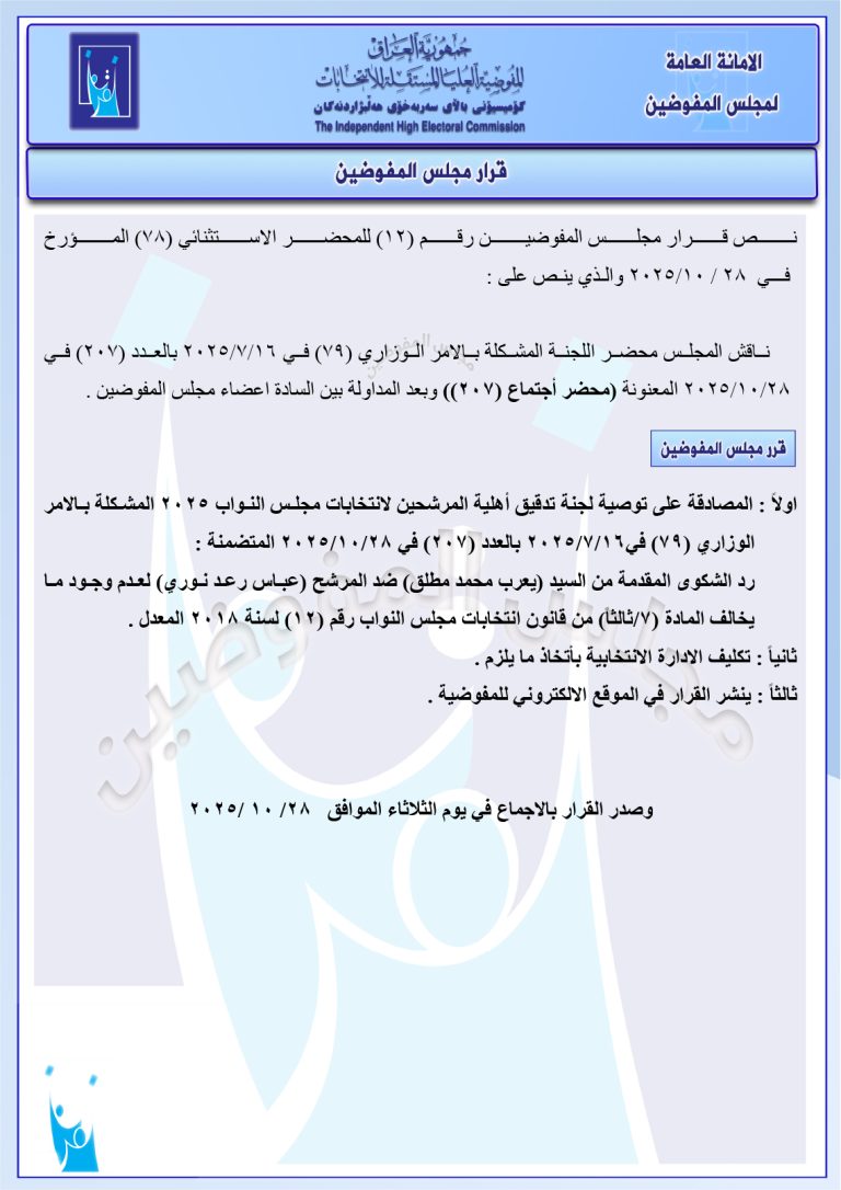 وأشارت وثائق صادرة عن المجلس حصلت عليها شبكة أخبار الانتخابات العراقية، إلى أن اللهيبي “قد قام علناً بالاساءة إلى القوات المسلحة العراقية متبنياً خطاباً طائفياً مثيراً للكراهية والتفرقة بين فئات الشعب العراقي”، مؤكدة “تكليف دائرة العمليات وتكنلوجيا المعلومات بحجب الأصوات التي قد يحصل عليها أثناء عملية الاقتراع وكذلك أصواته ضمن القائمة التي رشح من ضمنها”.