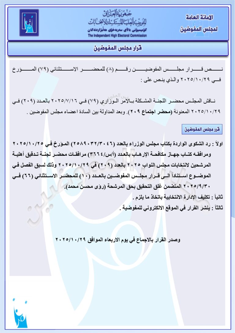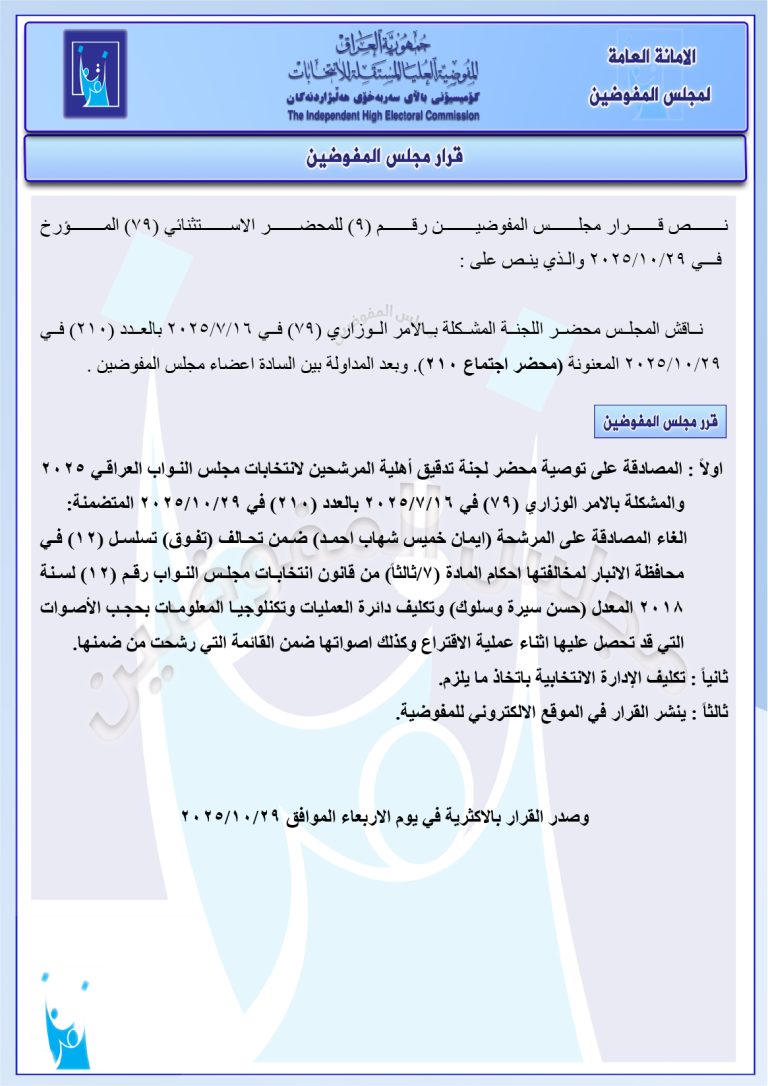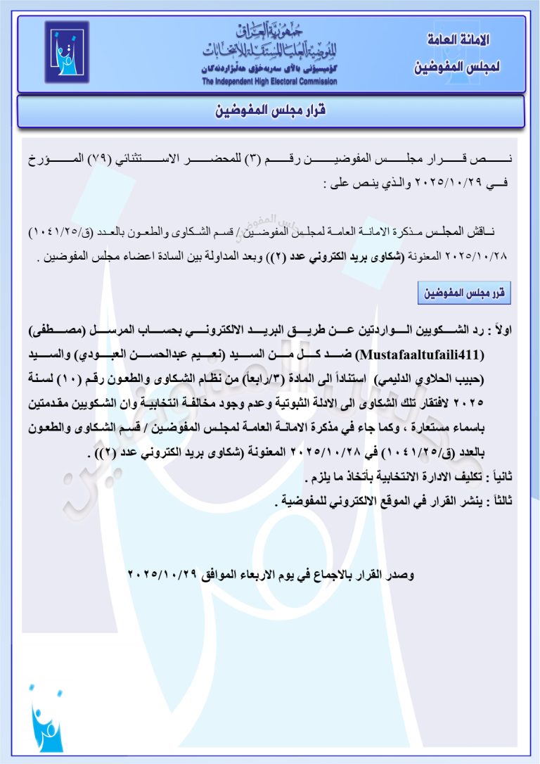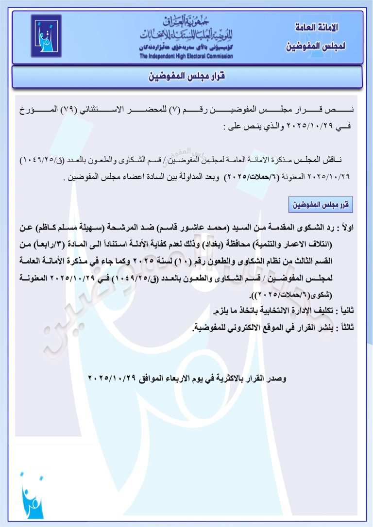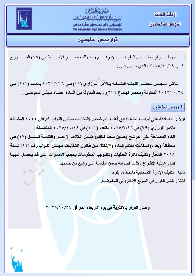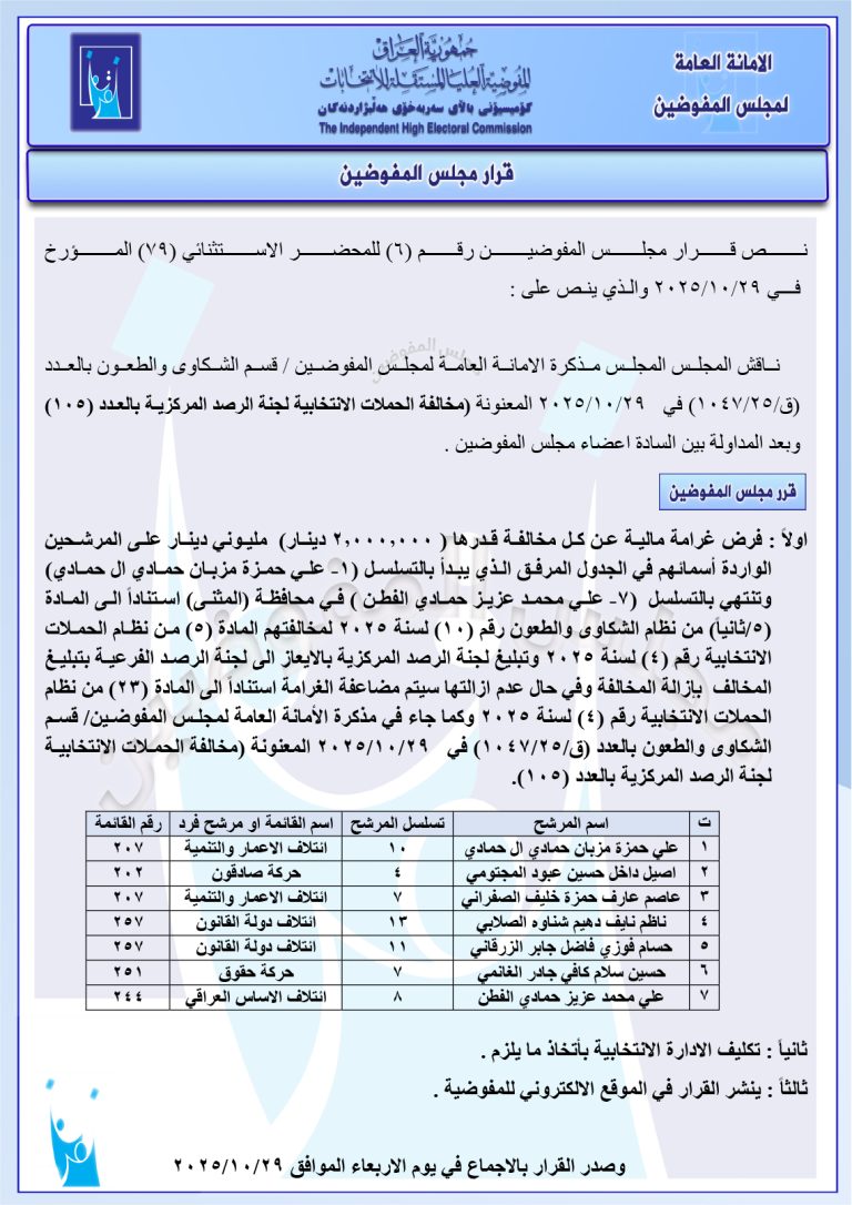 وثائق: قرارات جديدة لمجلس المفوضين تتضمن استبعاد حسين عرب ومرشحين آخرين من بابل والأنبار فرض غرامات ورد عدد من الشكاوى