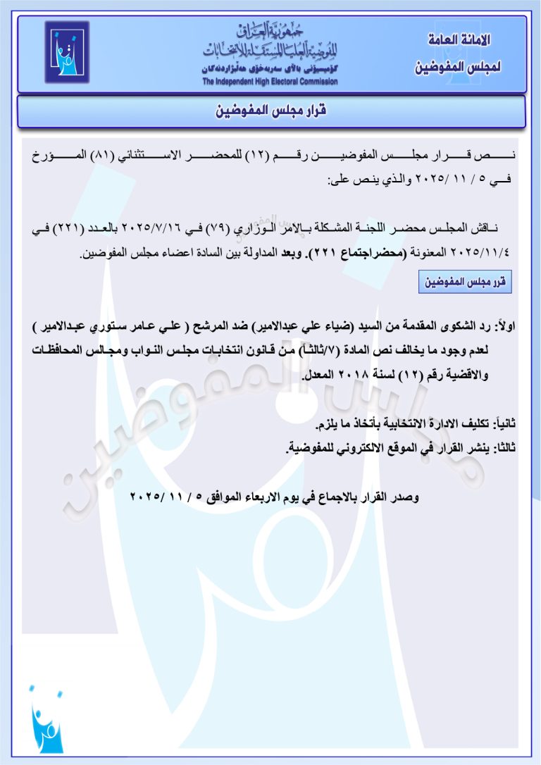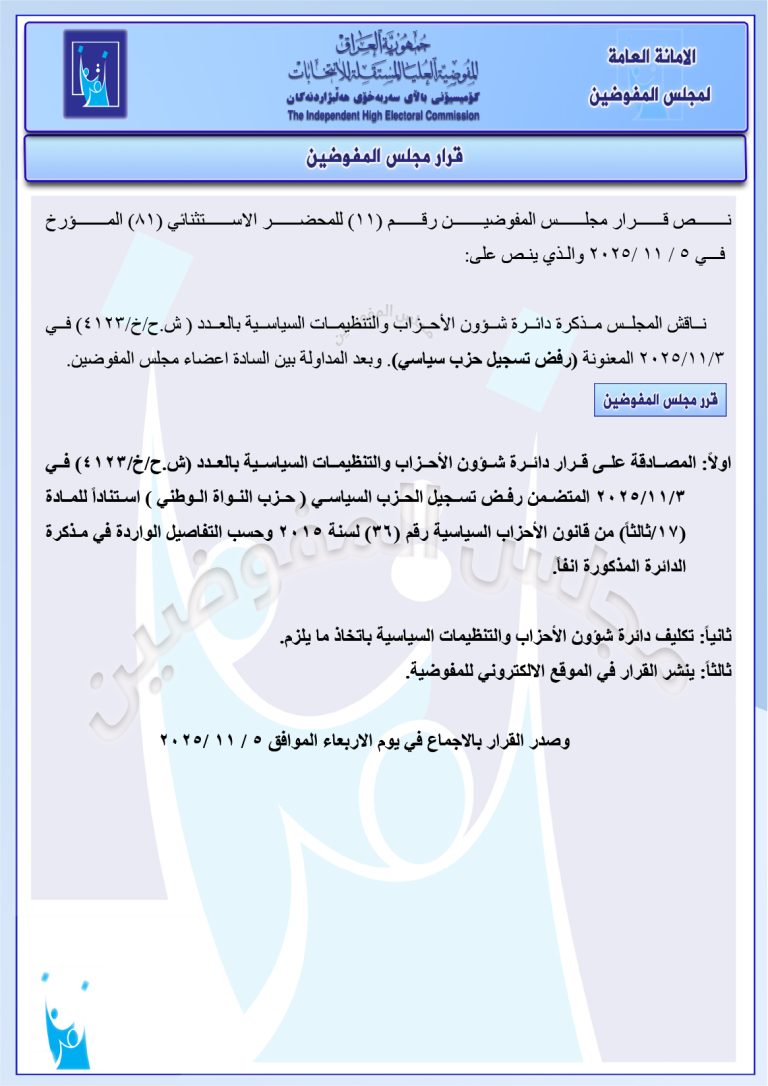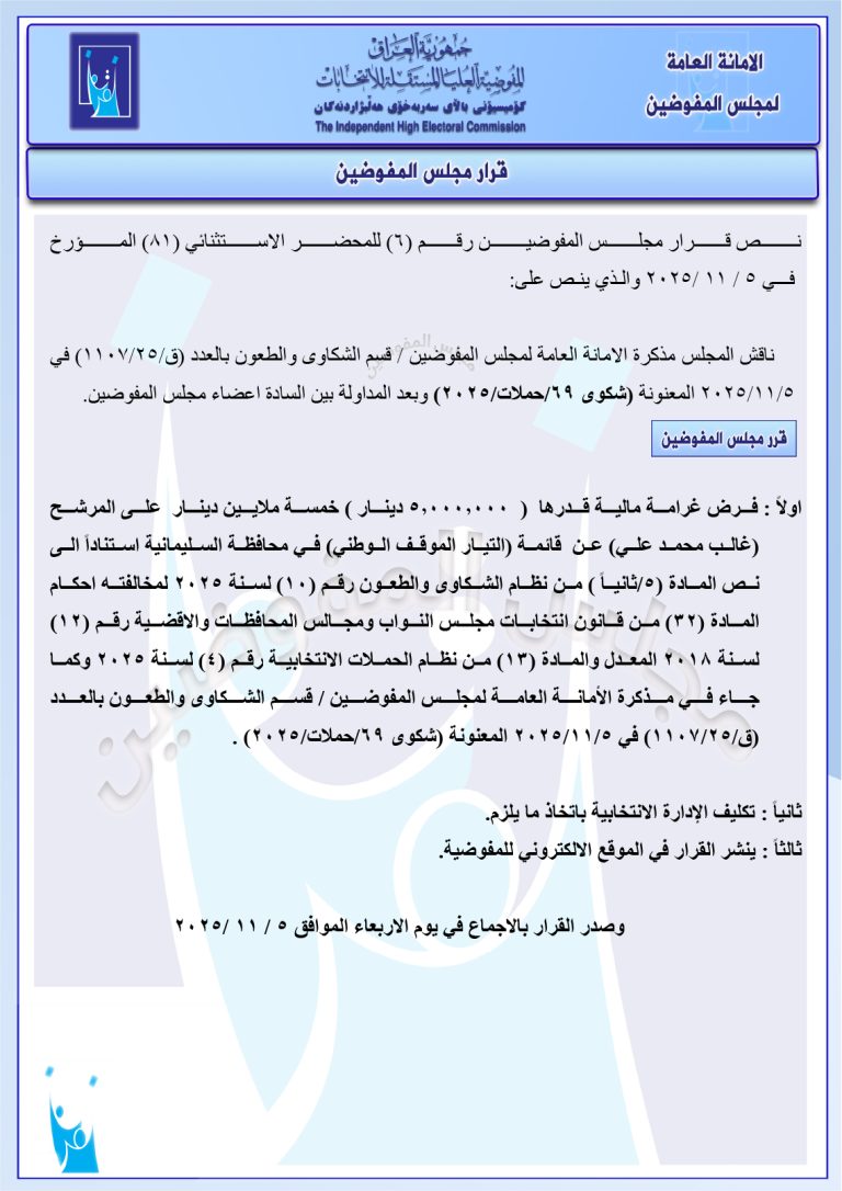 وثائق: مجلس المفوضين يرفض تسجيل حزب سياسي.. ويفرض غرامة على مرشح في السليمانية قرارات جديدة للمجلس